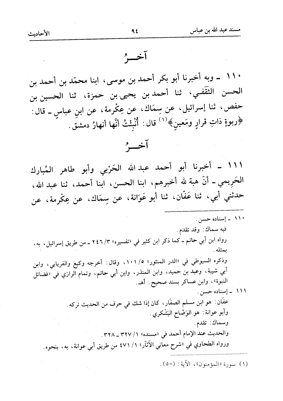 110 - وَبِهِ أَخْبَرَنَا أَبُو بَكْرٍ أَحْمَدُ بْنُ مُوسَى، أنبا مُحَمَّدُ بْنُ أَحْمَدَ بْنِ الْحَسَنِ الثَّقَفِيُّ، ثَنَا أَحْمَدُ بْنُ يَحْيَى بْنِ حَمْزَةَ، ثَنَا الْحُسَيْنُ بْنُ حَفْصٍ، ثَنَا إِسْرَائِيلُ، عَنْ سِمَاكٍ، عَنْ عِكْرِمَةَ، عَنِ ابْنِ عَبَّاسٍ، قَالَ: {رَبْوَةٍ ذَاتِ قَرَارٍ وَمَعِينٍ} [الْمُؤْمِنُونَ: 50] قَالَ: أُنْبِئْتُ أَنَّهَا أَنْهَارُ دِمَشْقَ