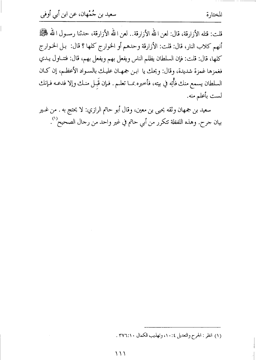 قلت قَتله الْأزَارِقَة، قَالَ: لعن الله الْأزَارِقَة حَدثنَا رَسُول الله صلى الله عَلَيْهِ وَسلم أَنهم كلاب النَّار قَالَ: قلت: الْأزَارِقَة وحدهم أَو الْخَوَارِج كلهَا؟ قَالَ: بل الْخَوَارِج كلهَا قَالَ: قلت فَإِن السُّلْطَان يظلم النَّاس وَيفْعل بهم وَيفْعل بهم قَالَ: فَتَنَاول يَدي فغمزها غمزة شَدِيدَة وَقَالَ وَيحك ياابن جمْهَان عَلَيْك بِالسَّوَادِ الْأَعْظَم إِن كَانَ السُّلْطَان يسمع مِنْك فأته فِي بَيته فَأخْبرهُ بِمَا تعلم. فَإِن قبل مِنْك وَإِلَّا فَدَعْهُ فَإنَّك لست بِأَعْلَم مِنْهُ.