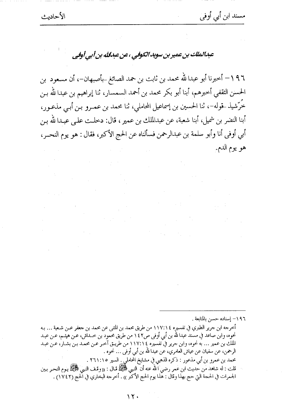 196 - أخبرنَا أَبُو عبد الله مُحَمَّد بن ثَابت بن حمد الصَّائِغ بأصبهان أَن مَسْعُود بن الْحسن الثَّقَفِيّ أخْبرهُم ابْنا أَبُو بكر مُحَمَّد بن أَحْمد السمسار ثَنَا إِبْرَاهِيم بن عبد الله بن خرشيذ قَوْله ثَنَا الْحُسَيْن بن إِسْمَاعِيل الْمحَامِلِي ثَنَا مُحَمَّد بن عَمْرو بن أبي مذعور ابْنا النَّضر بن شُمَيْل ابْنا شُعْبَة عَن عبد الْملك بن عُمَيْر قَالَ: دخلت على عبد الله بن أبي أوفى أَنا وَأَبُو سَلمَة بن عبد الرَّحْمَن فَسَأَلْنَاهُ عَن الْحَج الْأَكْبَر فَقَالَ: هُوَ يَوْم النَّحْر هُوَ يَوْم الدَّم.
