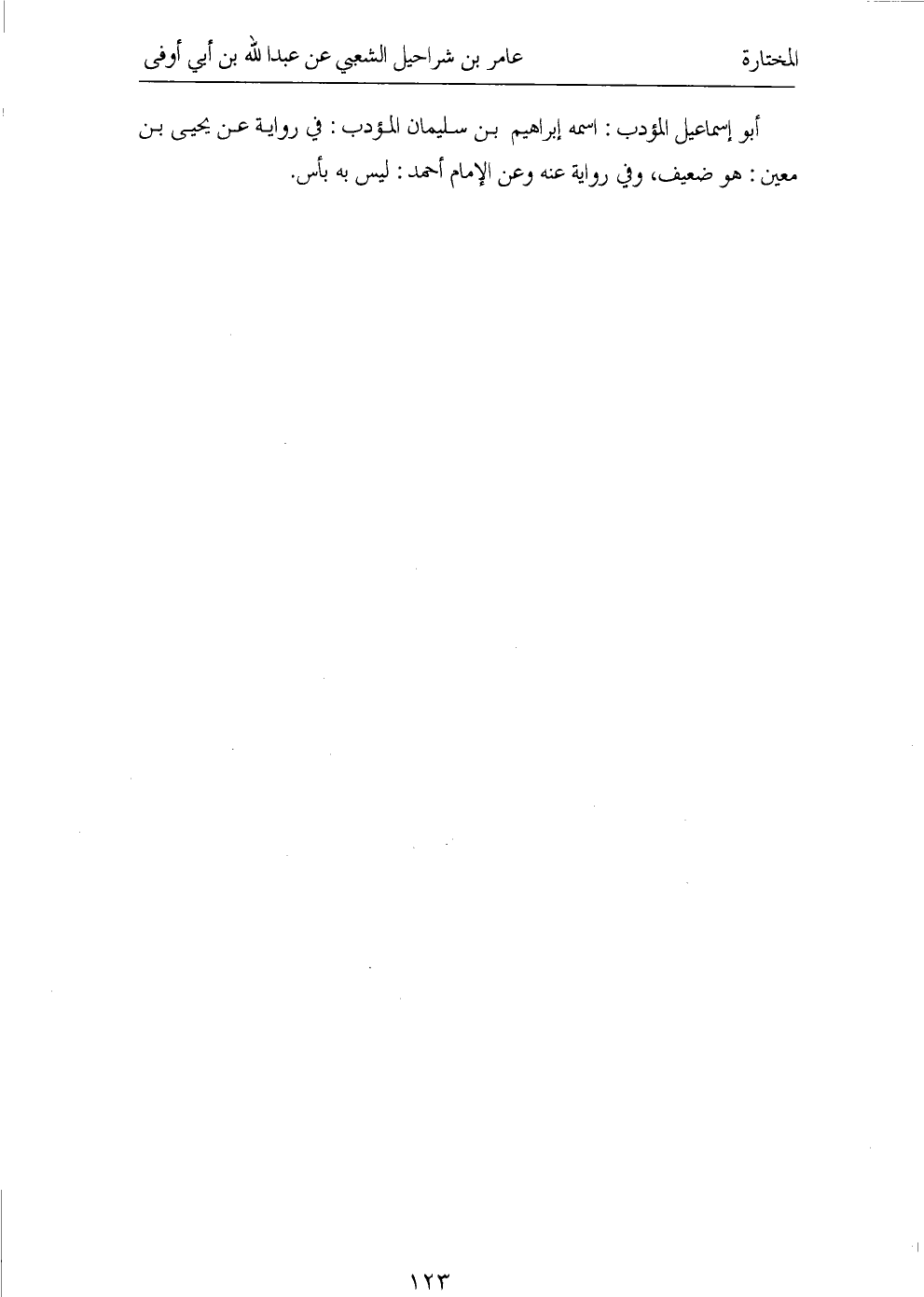أَبُو إِسْمَاعِيل الْمُؤَدب: اسْمه إِبْرَاهِيم بن سُلَيْمَان الْمُؤَدب: فِي رِوَايَة عَن يحيى بن معِين: هُوَ ضَعِيف وَفِي رِوَايَة عَنهُ وَعَن الإِمَام أَحْمد: لَيْسَ بِهِ بَأْس.