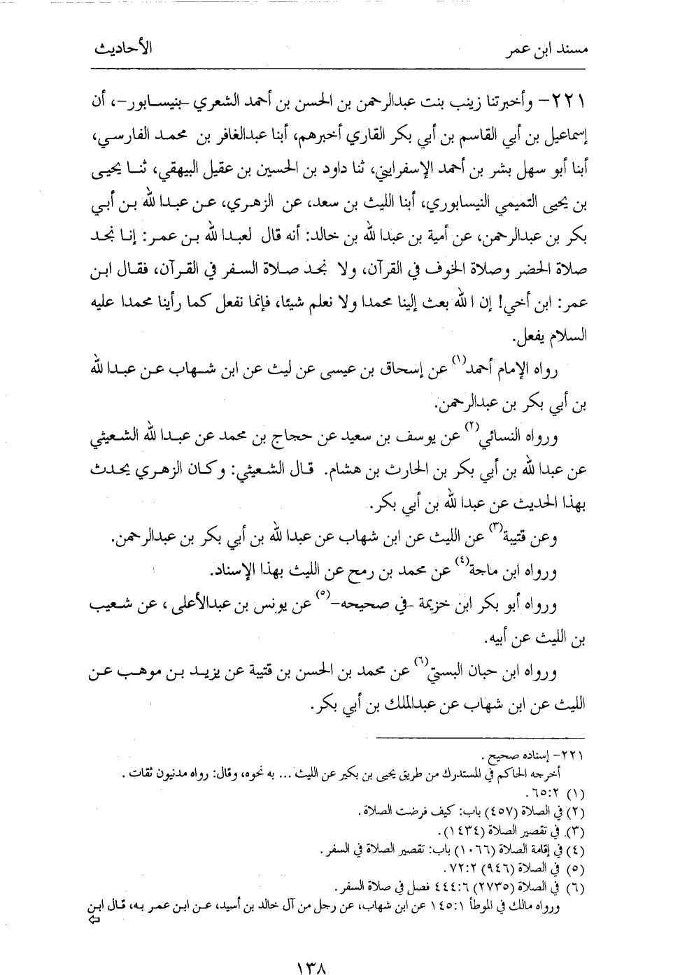 221 - وأخبرتنا زَيْنَب بنت عبد الرَّحْمَن بن الْحسن بن أَحْمد الشعري بنيسابور أَن إِسْمَاعِيل بن أبي الْقَاسِم بن أبي بكر الْقَارِي أخْبرهُم ابْنا عبد الغافر بن مُحَمَّد الْفَارِسِي ابْنا أَبُو سهل بشر بن أَحْمد الإِسْفِرَايِينِيّ ثَنَا دَاوُد بن الْحُسَيْن بن عقيل الْبَيْهَقِيّ ثَنَا يحيى بن يحيى التَّمِيمِي النَّيْسَابُورِي ابْنا اللَّيْث بن سعد عَن الزُّهْرِيّ عَن عبد الله بن أبي بكر بن عبد الرَّحْمَن عَن أُميَّة بن عبد الله بن خَالِد: أَنه قَالَ لعبد الله بن عمر: إِنَّا نجد صَلَاة الْحَضَر وَصَلَاة الْخَوْف فِي الْقُرْآن وَلَا نجد صَلَاة السّفر فِي الْقُرْآن فَقَالَ ابْن عمر: ابْن أخي! إِن الله بعث إِلَيْنَا مُحَمَّدًا وَلَا نعلم شَيْئا فَإِنَّمَا نَفْعل كَمَا رَأينَا مُحَمَّدًا عَلَيْهِ السَّلَام يفعل.