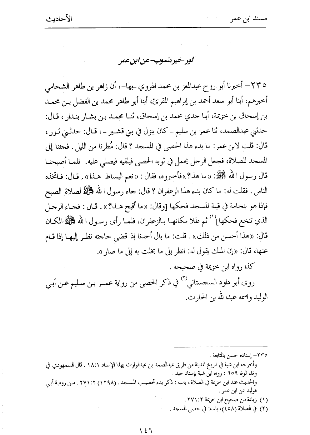 235 - أخبرنَا أَبُو روح عبد الْمعز بن مُحَمَّد الْهَرَوِيّ بهَا أَن زَاهِر بن طَاهِر الشحامي أخْبرهُم ابْنا أَبُو سعد احْمَد بن إِبْرَاهِيم المقرىء ابْنا أَبُو طَاهِر مُحَمَّد بن الْفضل بن مُحَمَّد بن إِسْحَاق بن خُزَيْمَة ابْنا جدي مُحَمَّد بن إِسْحَاق ثَنَا مُحَمَّد بن بشار بنْدَار قَالَ: حَدثنِي عبد الصَّمد ثَنَا عمر بن سليم كَانَ ينزل فِي بني قُشَيْر قَالَ: حَدثنِي ثَوْر قَالَ: قلت لِابْنِ عمر: مَا بَدْء هَذَا الْحَصَى فِي الْمَسْجِد؟ قَالَ: مُطِرْنَا من اللَّيْل. فَجِئْنَا إِلَى الْمَسْجِد للصَّلَاة فَجعل الرجل يحمل فِي ثَوْبه الْحَصَى فيلقيه فَيصَلي عَلَيْهِ. فَلَمَّا أَصْبَحْنَا قَالَ رَسُول الله صلى الله عَلَيْهِ وَسلم: " مَا هَذَا؟ " فأخبروه فَقَالَ: " نعم الْبسَاط هَذَا " قَالَ: فاتخذه النَّاس. فَقلت لَهُ: مَا كَانَ بَدْء هَذَا الزَّعْفَرَان؟ قَالَ: جَاءَ رَسُول الله صلى الله عَلَيْهِ وَسلم لصَلَاة الصُّبْح فَإِذا هُوَ بنخامة فِي قبْلَة الْمَسْجِد فحكها وَقَالَ: " مَا اقبح هَذَا؟ " قَالَ: فجَاء الرجل الَّذِي تنخع فحكها ثمَّ طلا مَكَانهَا بالزعفران فَلَمَّا رأى رَسُول الله صلى الله عَلَيْهِ وَسلم الْمَكَان قَالَ: " هَذَا أحسن من ذَلِك ". قلت: مَا بَال أَحَدنَا إِذا قضى حَاجته نظر إِلَيْهَا إِذا قَامَ عَنْهَا قَالَ: " عَن الْملك يَقُول لَهُ: انْظُر إِلَى مَا بخلت بِهِ إِلَى مَا صَار ".