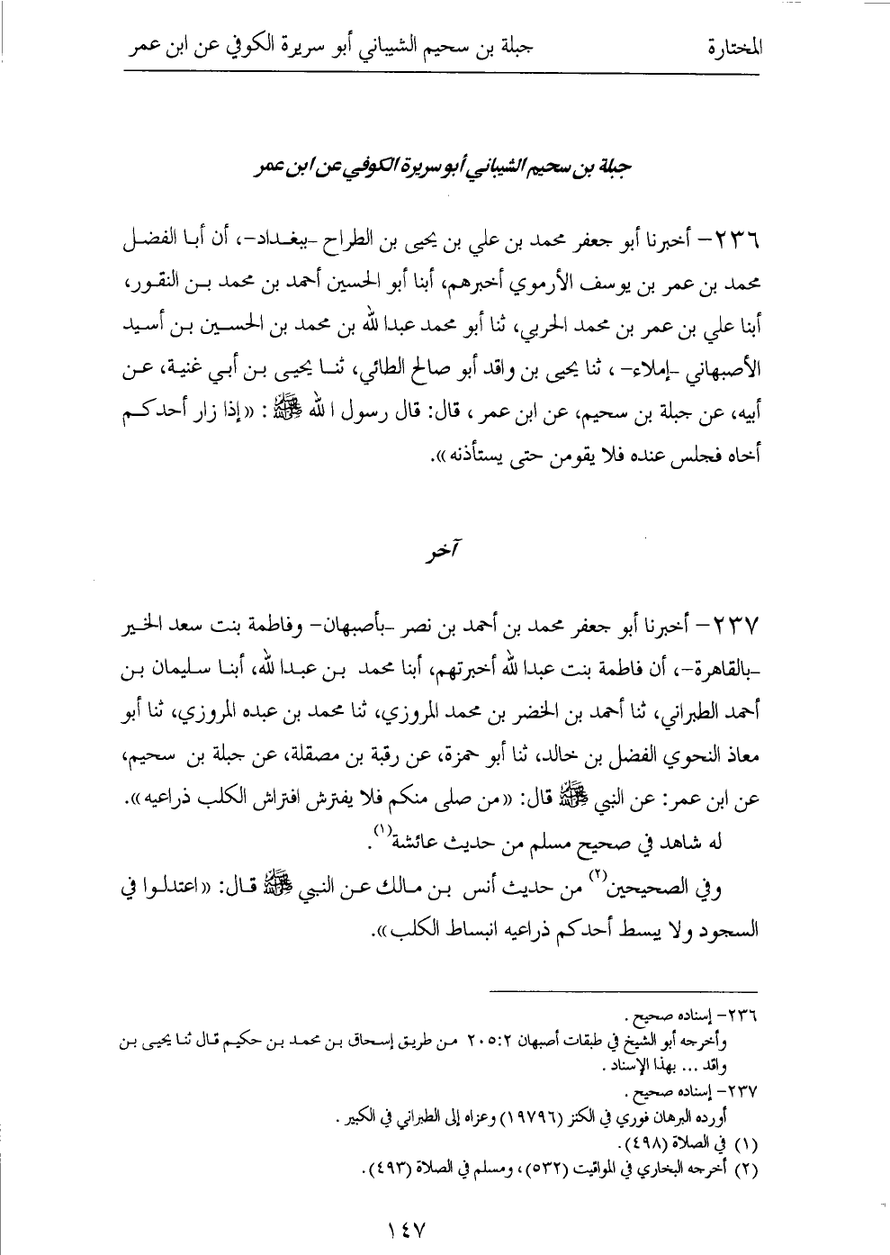 237 - أخبرنَا أَبُو جَعْفَر مُحَمَّد بن عَليّ بن يحيى بن الطراح بِبَغْدَاد أَن أَبَا الْفضل مُحَمَّد بن عمر بن يُوسُف الأرموي أخْبرهُم ابْنا أَبُو الْحُسَيْن أَحْمد بن مُحَمَّد بن النقور ابْنا عَليّ بن عمر بن مُحَمَّد الْحَرْبِيّ ثَنَا أَبُو مُحَمَّد عبد الله بن مُحَمَّد بن الْحُسَيْن بن أسيد الْأَصْبَهَانِيّ إملاء ثَنَا يحيى بن وَاقد أَبُو صَالح الطَّائِي ثَنَا يحيى بن أبي غنية عَن أَبِيه عَن جبلة بن سحيم عَن ابْن عمر: عَن النَّبِي صلى الله عَلَيْهِ وَسلم قَالَ: " من صلى مِنْكُم فَلَا يفترش افتراش الْكَلْب ذِرَاعَيْهِ ".