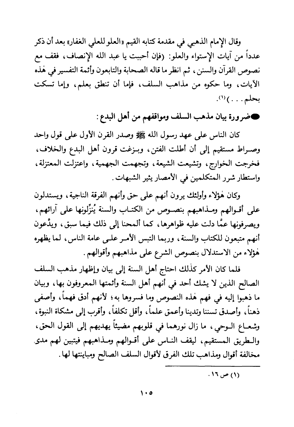 فلما كان الأمر كذلك احتاج أهل السنة إلى بيان وإظهار مذهب السلف الصالح الذين لا يشك أحد في أنهم أهل السنة وأئمتها المعروفون بها، وبيان ما ذهبوا إليه في فهم هذه النصوص وما فسروها به؛ لأنهم أدق فهمًا، وأصفى ذهنًا، وأصدق تسننًا وتدينًا وأعمق علمًا، وأقل تكلفًا، وأقرب إلى مشكاة النبوة، وشعاع الوحي، ما زال نورهما في قلوبهم مضيئًا يهيديهم إلى القول الحق، والطريق المستقيم، ليقف الناس على أقوالهم ومذاهبهم فيتبين لهم مدى مخالفة أقوال ومذاهب تلك الفرق لأقوال السلف الصالح ومباينتها لها.