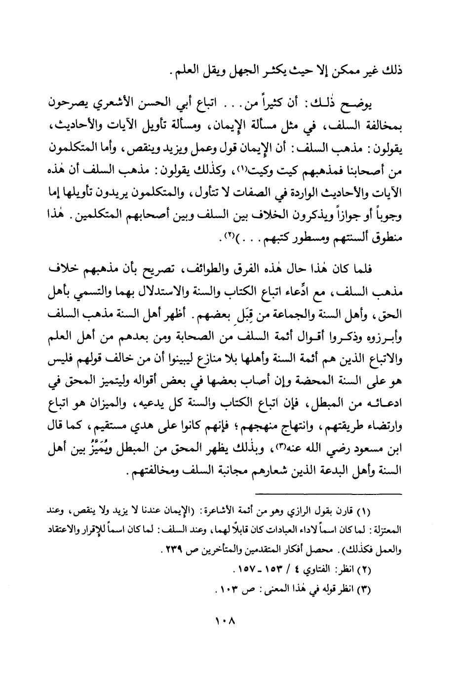 1 قارن بقول الرازي وهو من أئمة الأشاعرة: "الإيمان عندنا لا يزيد ولا ينقص، وعند المعتزلة: لما كان اسمًا لأداء العبادات كان قابلًا لهما، وعند السلف، لما كان اسمًا للإقرار والاعتقاد والعمل فكذلك". محصل أفكار المتقدمين والمتأخرين ص 239.