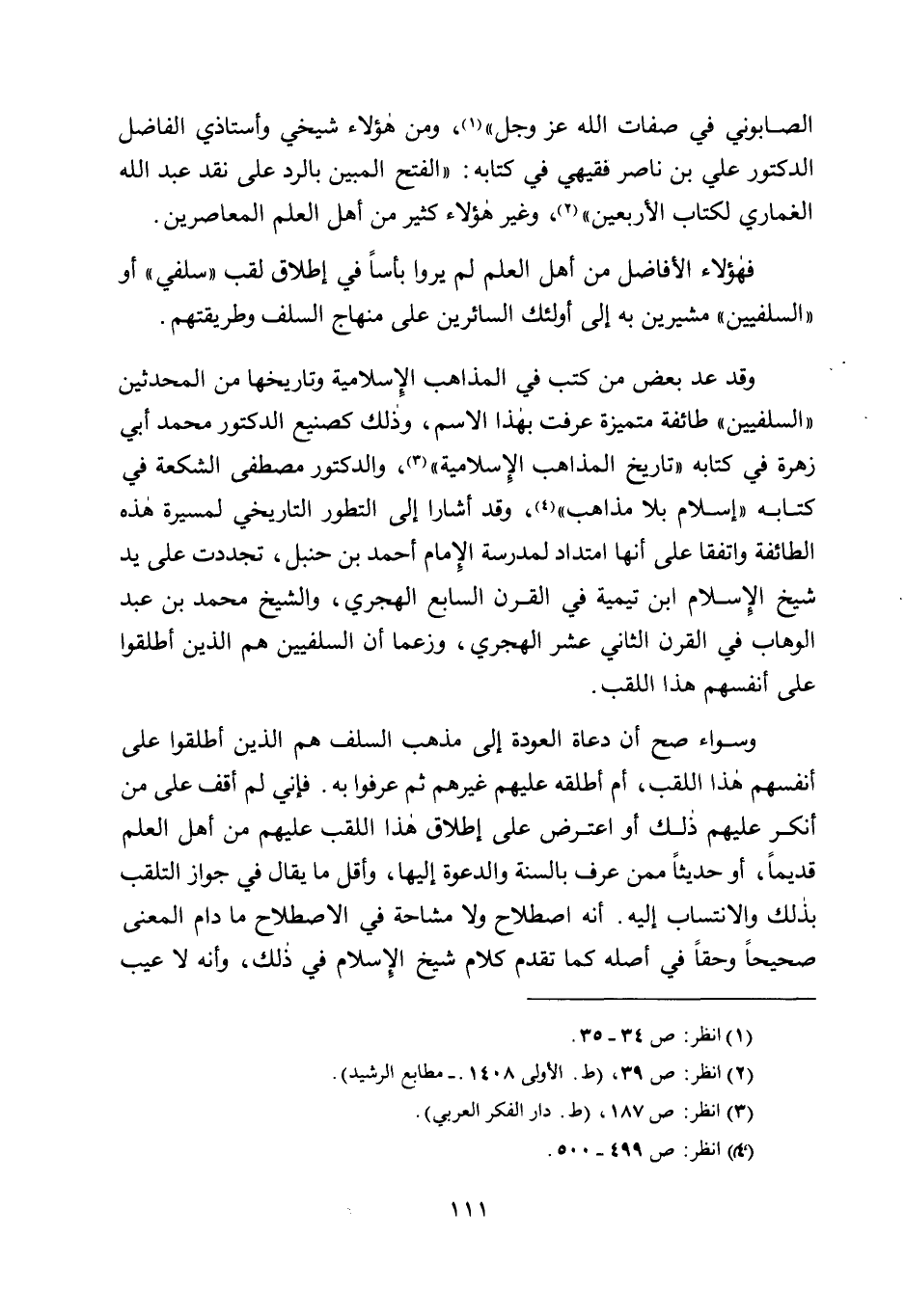 وسواء صح أن دعاة العودة إلى مذاهب السلف هم الذين أطلقوا على أنفسهم هذا القب، أم أطلقه عليهم غيرهم ثم عرفوا به؛ فإني لم أقف على من أنكر عليهم ذلك أو اعترض على إطلاق هذا اللقب عليهم من أهل العلم قديمًا، أو حديثًا ممن عرف بالسنة والدعوة إليها، وأقل ما يقال في جواز التلقب بذلك والانتساب إليه. وأنه اصطلاح ولا مشاحة في الاصطلاح ما دام المعنى صحيحًا وحقًا في أصله كما تقدم كلام شيخ الإسلام في ذلك، وأنه لا عيب