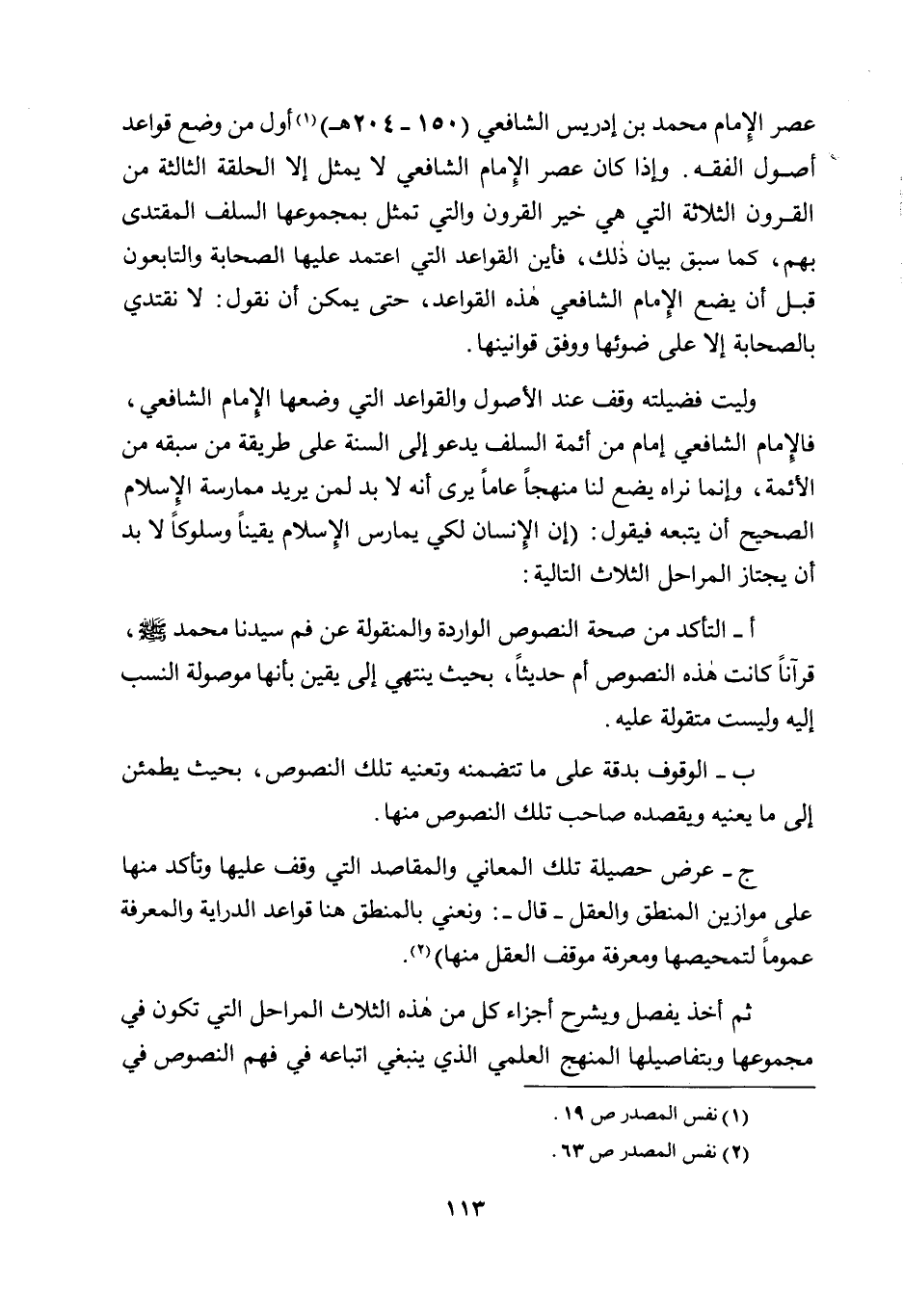 وليت فضيلته وقف عند الأصول والقواعد التي وضعها الإمام الشافعي؛ فالإمام الشافعي إمام من أئمة السلف يدعو إلى السنة على طريقة من سبقه من الأئمة؛ وإنما نراه يضع لنا منهجًا عامًا يرى أنه لا بد لمن يريد ممارسة الإسلام الصحيح أن يتبعه فيقول: "إن الإنسان لكي يمارس الإسلام يقينًا وسلوكًا لا بد أن يجتاز المراحل الثلاث التالية: