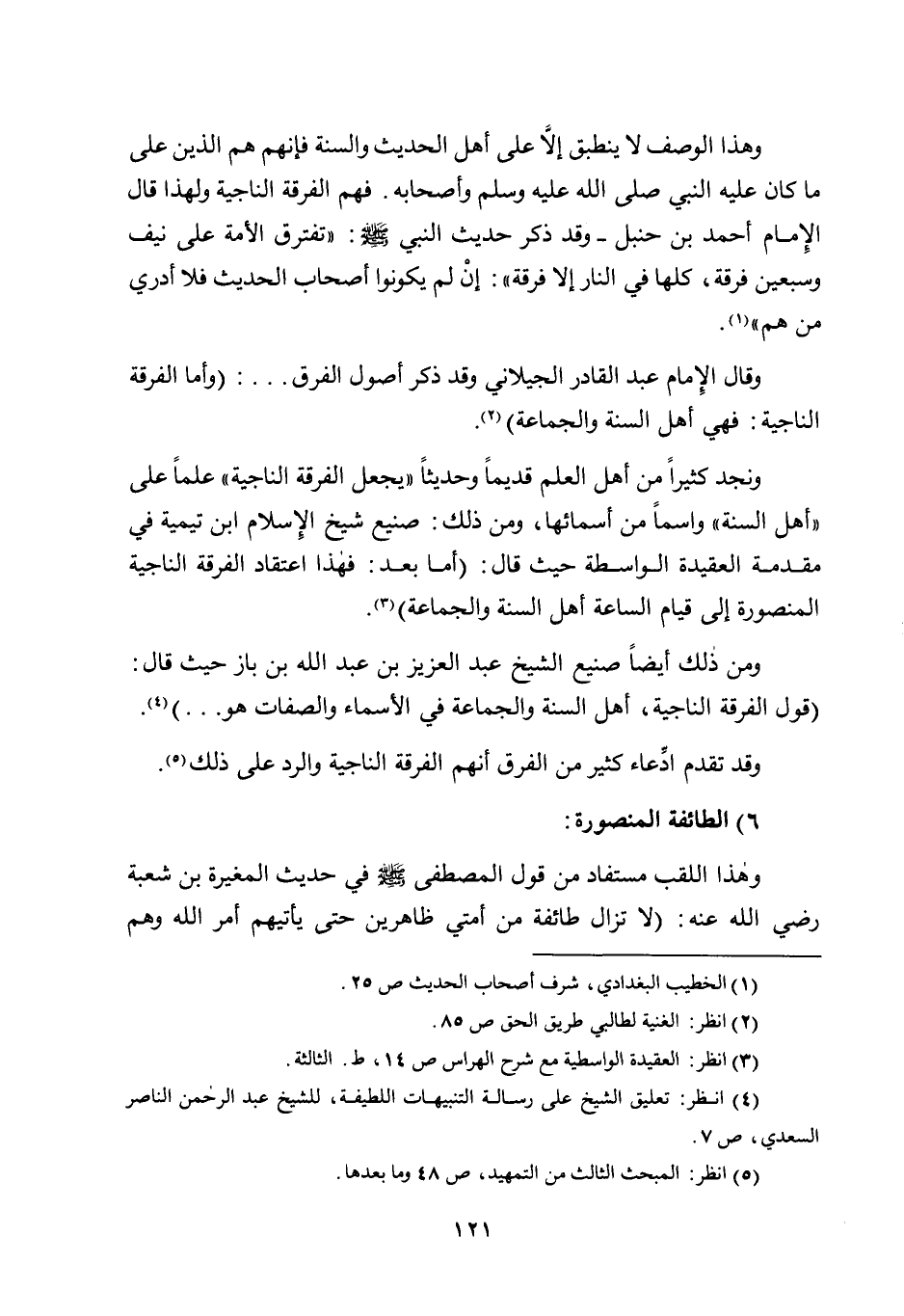 وهذا الوصف لا ينطبق إلا على أهل الحديث والسنة؛ فإنهم هم الذين على ما كان عليه النبي صلى الله عليه وسلم وأصحابه. فهم الفرقة الناجية ولهذا قال الإمام أحمد بن حنبل، وقد ذكر حديث النبي صلى الله عليه وسلم: "تفترق الأمة على نيف وسبعين فرقة، كلها في النار إلا فرقة": إن لم يكونوا أصحاب الحديث فلا أدري من هم1.