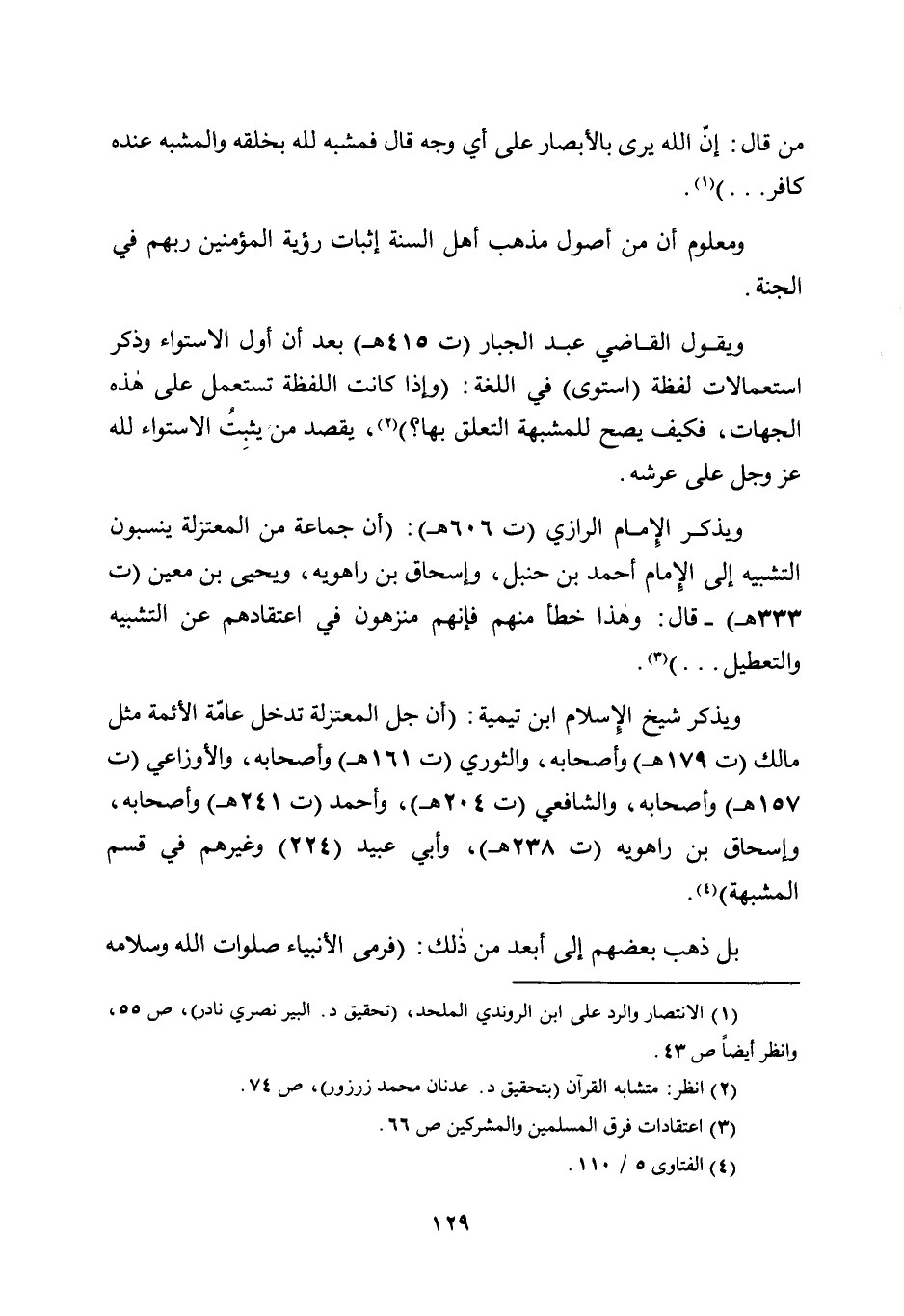 ويذكر شيخ الإسلام ابن تيمية: "أن جل المعتزلة تدخل عامة الأئمة مثل مالك "ت 179 هـ" وأصحابه، والثوري "ت 161 هـ" وأصحابه، والأوزاعي "ت 157 هـ" وأصحابه، والشافعي "ت 204 هـ"، وأحمد "ت 241 هـ" وأصحابه، وإسحاق بن راهويه "ت 238 هـ"، وأبي عبيد "224" وغيرهم في قسم المشبهة"4.
