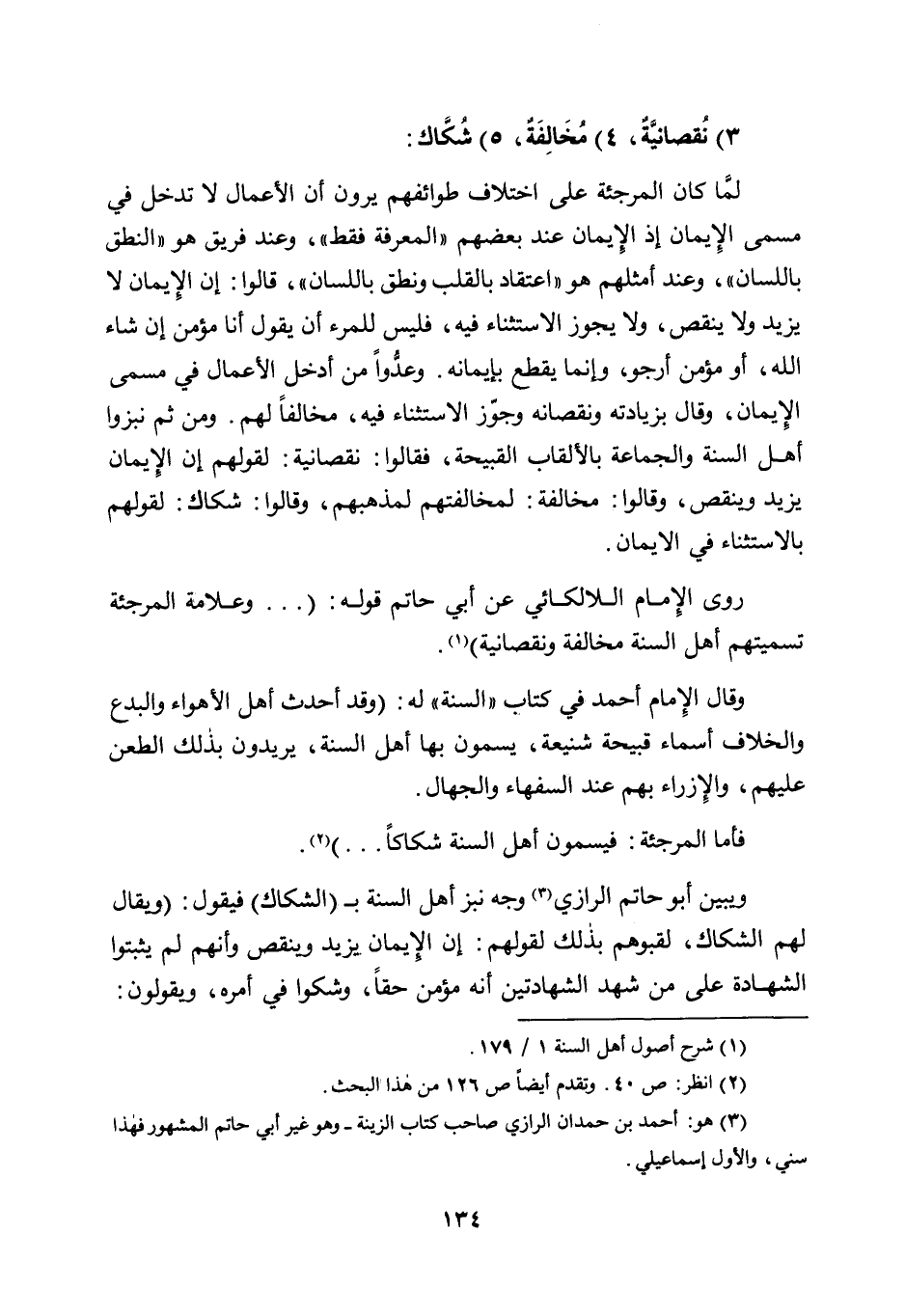 ويبين أبو حاتم الرازي3 وجه نبز أهل السنة بـ "الشكاك" فيقول: "ويقال لهم الشكاك، لقبوهم بذلك لقولهم: إن الإيمان يزيد وينقص وأنهم لم يثبتوا الشهادة على من شهد الشهادتين أنه مؤمن حقًا، وشكوا في أمره، ويقولون: