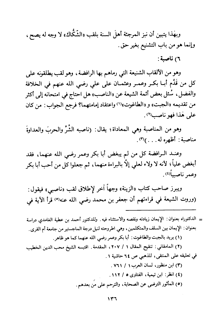 ويبرز صاحب كتاب "الزينة" وجهًا آخر لإطلاق لقب "ناصبي" فيقول: "وروت الشيعة في قراءتهم أن جعفر بن محمد رضي الله عنه5 قرأ الآية في