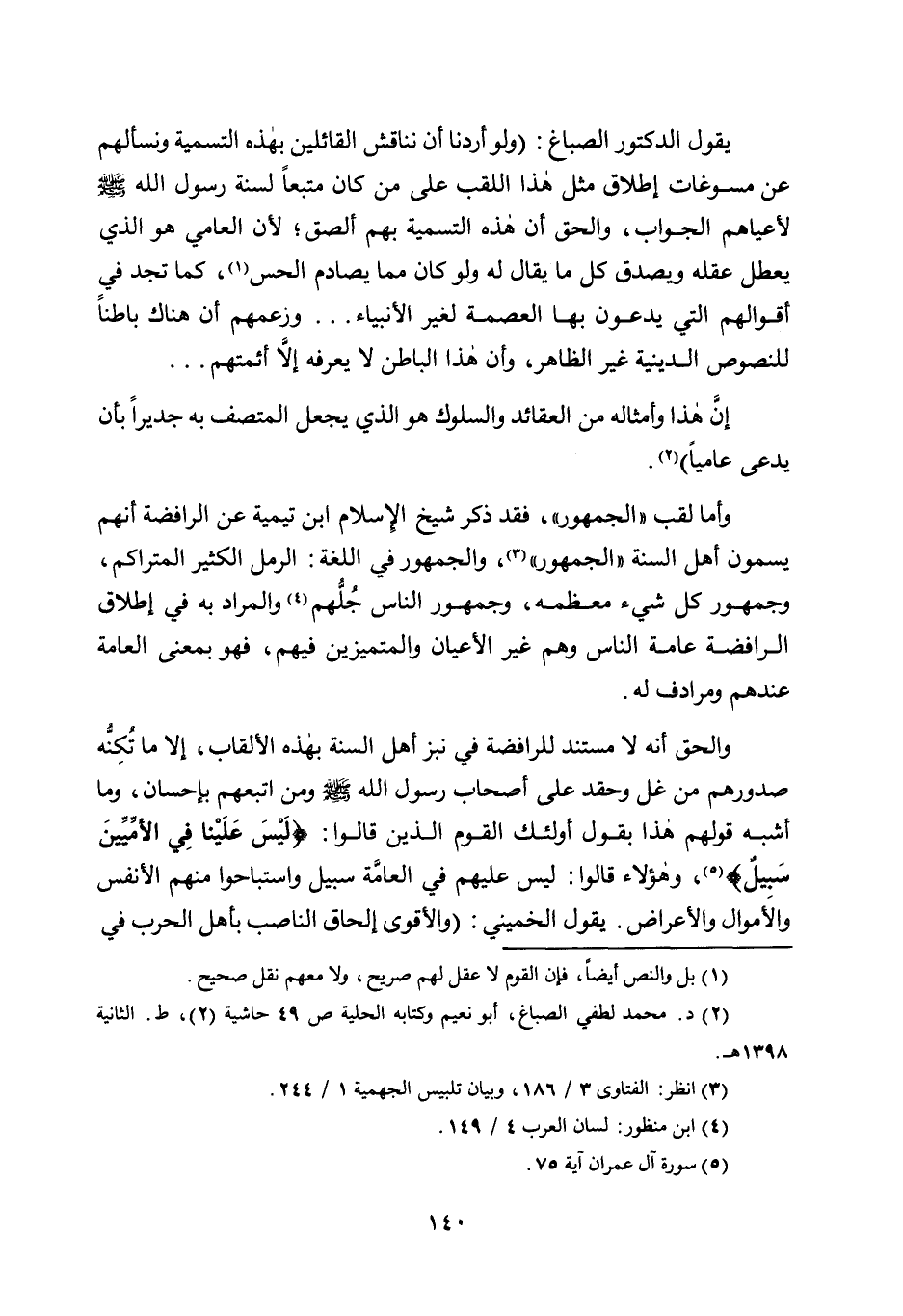 يقول الدكتور الصباغ: "ولو أردنا أن نناقض القائلين بهذه التسمية ونسألهم عن مسوغات إطلاق مثل هذا اللقب على من كان متبعًا لسنة رسول الله صلى الله عليه وسلم لأعياهم الجواب، والحق أن هذه التسمية بهم ألصق؛ لأن العامي هو الذي يعطل عقله ويصدق كل ما يقال له، ولو كن مما يصادم الحسن1، كما تجد في أقوالهم التي يدعون بها العصمة لغير الأنبياء، وزعمهم أن هناك باطنًا للنصوص الدينية غير الظاهر، وأن هذا الباطن لا يعرفه إلا أئمتهم.
