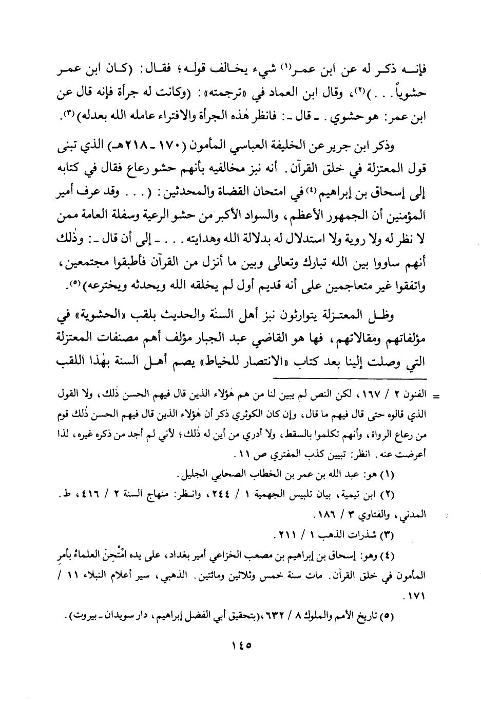 وذكر ابن جرير عن الخليفة العباسي المأمون "170- 218 هـ" الذي تبنى قوله المعتزلة في خلق القرآن. أنه نبز مخالفيه بأنهم حشو رعاع فقال في كتابه إلى إسحاق بن إبراهيم4 في امتحان القضاة والمحدثين، وقد عرف أمير المؤمنين أن الجمهور الأعظم، والسواد الأكبر من حشو الرعية وسفلة العامة ممن لا نظرله ولا روية ولا استدلال له بدلالة الله وهدايته. -إلى أن قال- وذلك أنهم ساووا بين الله تبارك وتعالى وبين ما أنزل من القرآن فأطبقوا مجتمعين، واتفقوا غير متعاجمين على أنه قديم أول لم يخلقه الله ويحدثه ويخترعه"5.