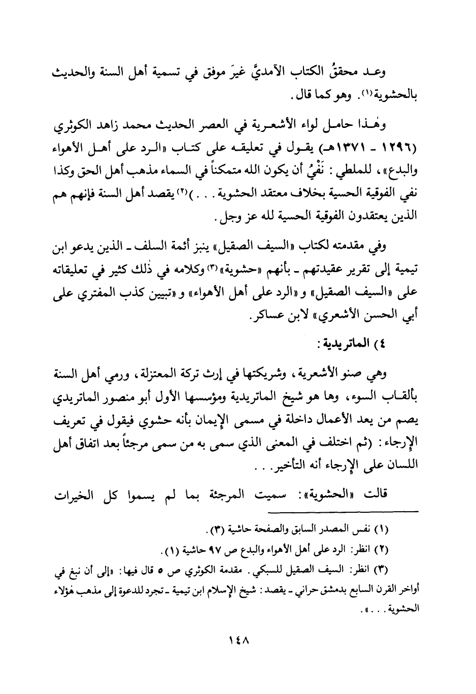 3 انظر: السيف الصقيل للسبكي. مقدمة الكوثري ص5 قال فيها: إلى أن نبغ في أواخر القرن السابع بدمشق حراني -يقصد: شيخ الإسلام ابن تيمية- تجرد للدعوة إلى مذهب هؤلاء الحشوية".