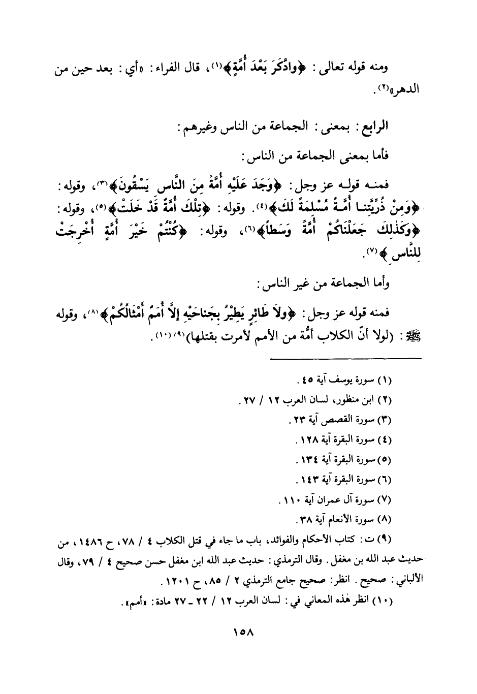 فمنه قوله عز وجل: {وَجَدَ عَلَيْهِ أُمَّةً مِنَ النَّاسِ يَسْقُونَ} 3، وقوله: {وَمِنْ ذُرِّيَّتِنَا أُمَّةً مُسْلِمَةً لَكَ} 4. وقوله: {تِلْكَ أُمَّةٌ قَدْ خَلَتْ} 5، وقوله: {وَكَذَلِكَ جَعَلْنَاكُمْ أُمَّةً وَسَطًا} 6، وقوله: {كُنْتُمْ خَيْرَ أُمَّةٍ أُخْرِجَتْ لِلنَّاسِ} 7.