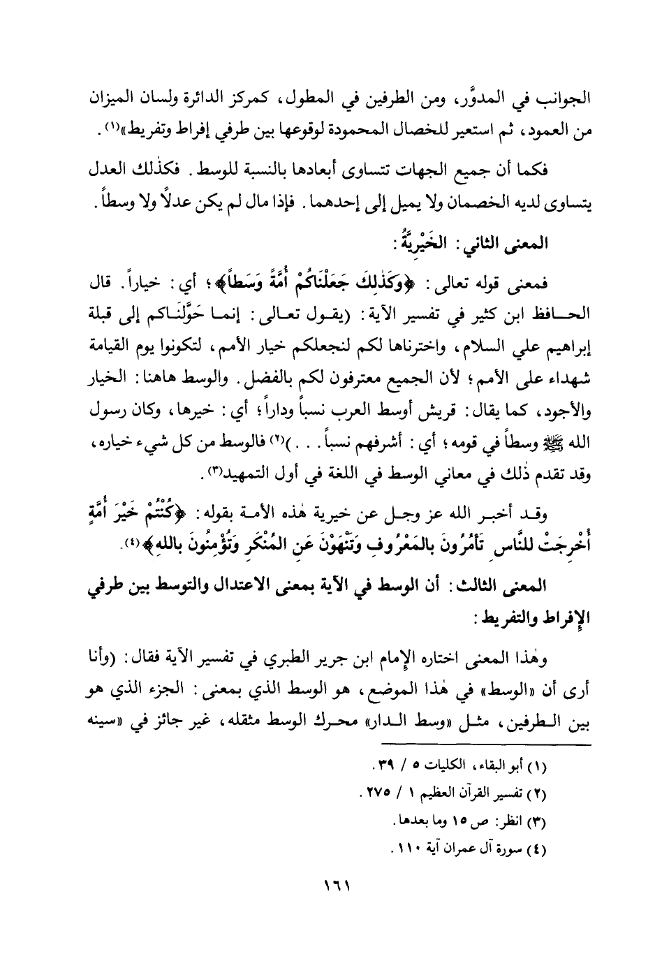 المعنى الثالث: أن الوسط في الآية بمعنى الاعتدال والتوسط بين طرفي الإفراط والتفريط: