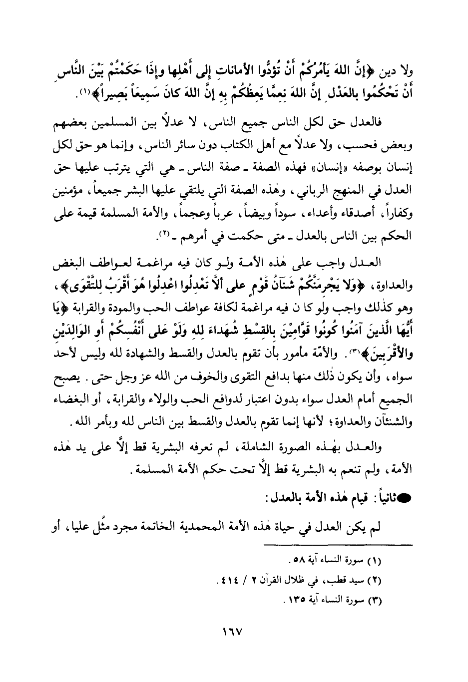العدل واجب على هذه الأمة، ولو كان فيه مراغمة لعواطف البغض والعداوة، {وَلا يَجْرِمَنَّكُمْ شَنَآنُ قَوْمٍ عَلَى أَلَّا تَعْدِلُوا اعْدِلُوا هُوَ أَقْرَبُ لِلتَّقْوَى} ، وهو كذلك واجب، ولو كان فيه مراغمة لكافة عواطف الحب والمودة والقرابة {يَا أَيُّهَا الَّذِينَ آمَنُوا كُونُوا قَوَّامِينَ بِالْقِسْطِ شُهَدَاءَ لِلَّهِ وَلَوْ عَلَى أَنْفُسِكُمْ أَوِ الْوَالِدَيْنِ وَالْأَقْرَبِينَ} 3. والأمة مأمور بأن تقوم بالعدل والقسط والشهادة لله وليس لأحد سواه، وأن يكون ذلك منها بدون اعتبار لدوافع الحب والولاء والقرابة، أو البغضاء والشنئان والعداوة؛ لأنهما إنما تقوم بالعدل والقسط بين الناس لله وبأمر الله.