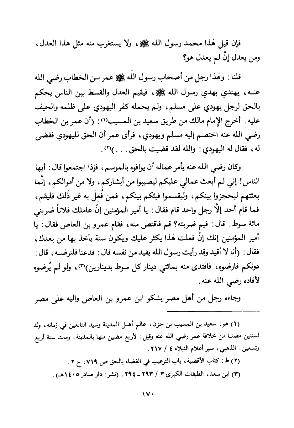 قلنا: وهذا رجل من أصحاب رسول الله صلى الله عليه وسلم عمر بنا لخطاب رضي الله عنه، يهتدي بهدي رسول الله صلى الله عليه وسلم، فيقيم العدل والقسط بين الناس يحكم بالحق لرجل يهودي على مسلم، ولم يحمله كفر اليهودي على ظلمه والحيف عليه. أخرج الإمام مالك من طريق سعيد بن المسيب1: أن عمر بن الخطاب رضي الله عنه اختصم إليه مسلم ويهودي؛ فرأى عمر أن الحق لليهودي فقضي له، فقال له اليهودي: والله لقد قضيت بالحق2.