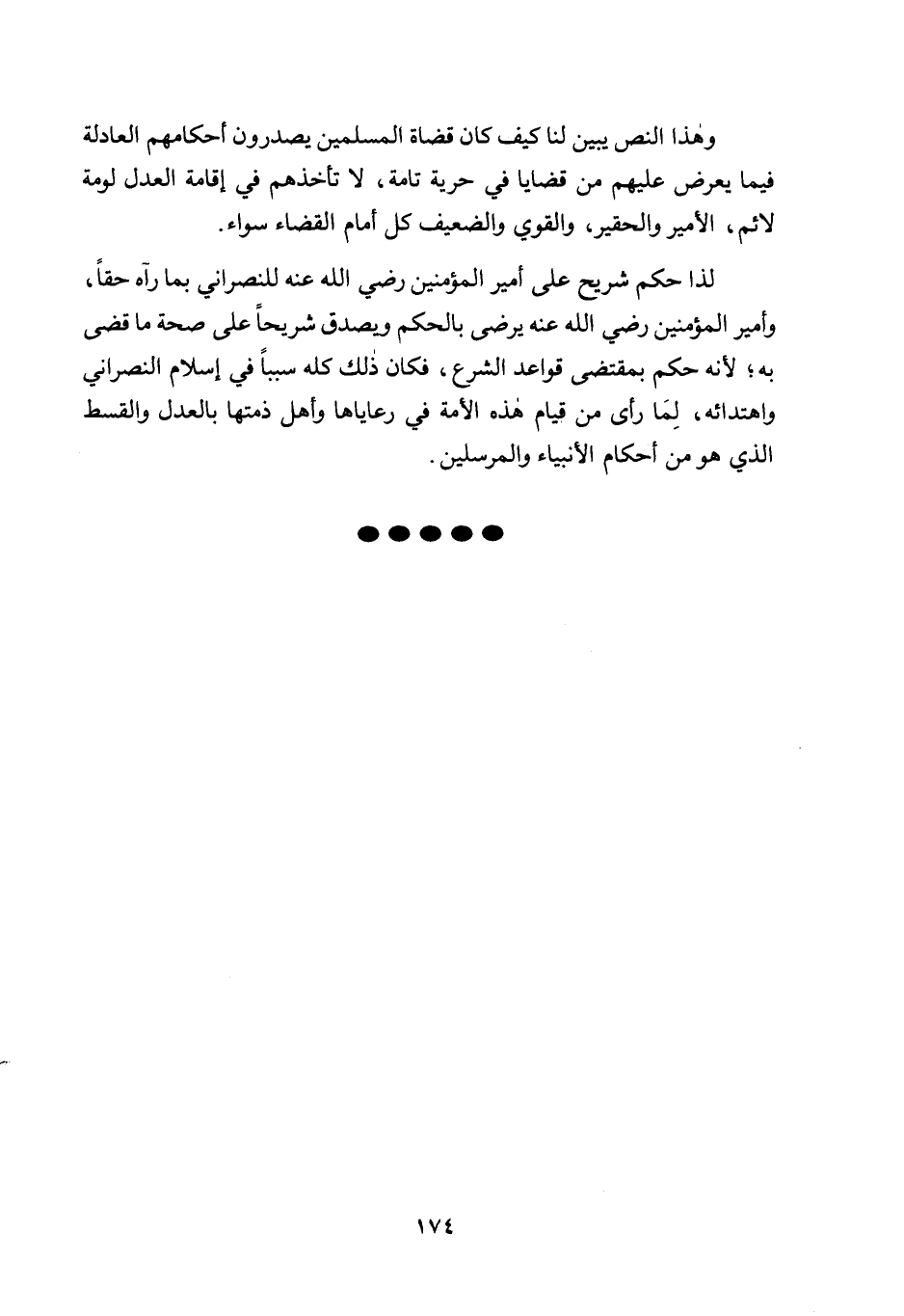 وهذا النص يبين لنا كيف كان قضاة المسلمين يصدرون أحكامهم العادلة فيما يعرض عليهم من قضايا في حرية تامة، لا تأخذهم في إقامة العدل لومة لائم، الأمير والحقير، والقوي والضعيف كل أمام القضاء سواء؛ لذا حكم شريح على أمير المؤمنين رضي الله عنه للنصراني بما رآه حقًا، وأمير المؤمنين رضي الله عنه يرضي بالحكم ويصدق شريحًا على صحة ما قضى به؛ لأنه حكم بمقتضى قواعد الشرع، فكان ذلك كله سببًا في إسلام النصراني واهتدائه، لما رأى من قيام هذه الأمة في رعاياها وأهل ذمتها بالعدل والقسط الذي هو من أحكام الأنبياء والمرسلين.