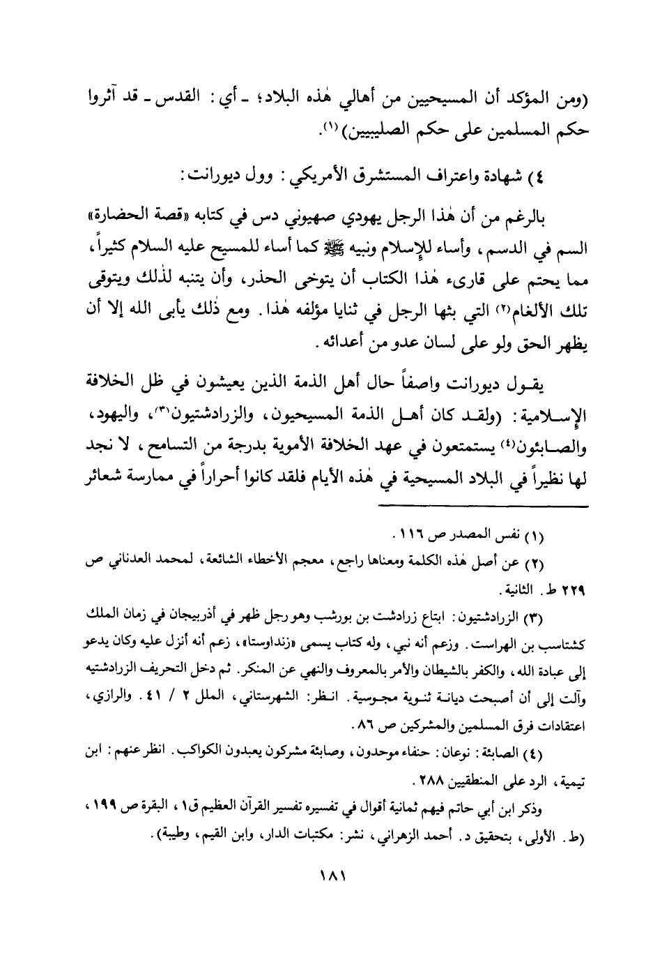 يقول ديورانت واصفًا حال أهل الذمة الذين يعيشون في ظل الخلافة الإسلامية: "ولقد كان أهل الذمة المسيحيون، والزرادشتيون3، واليهود، والصابئون4 يستمتعون في عهد الخلافة الأموية بدرجة من التسامح، لا نجد لها نظيرًا في البلاد المسيحية في هذه الأيام فلقد كانوا أحرارًا في ممارسة شعائر