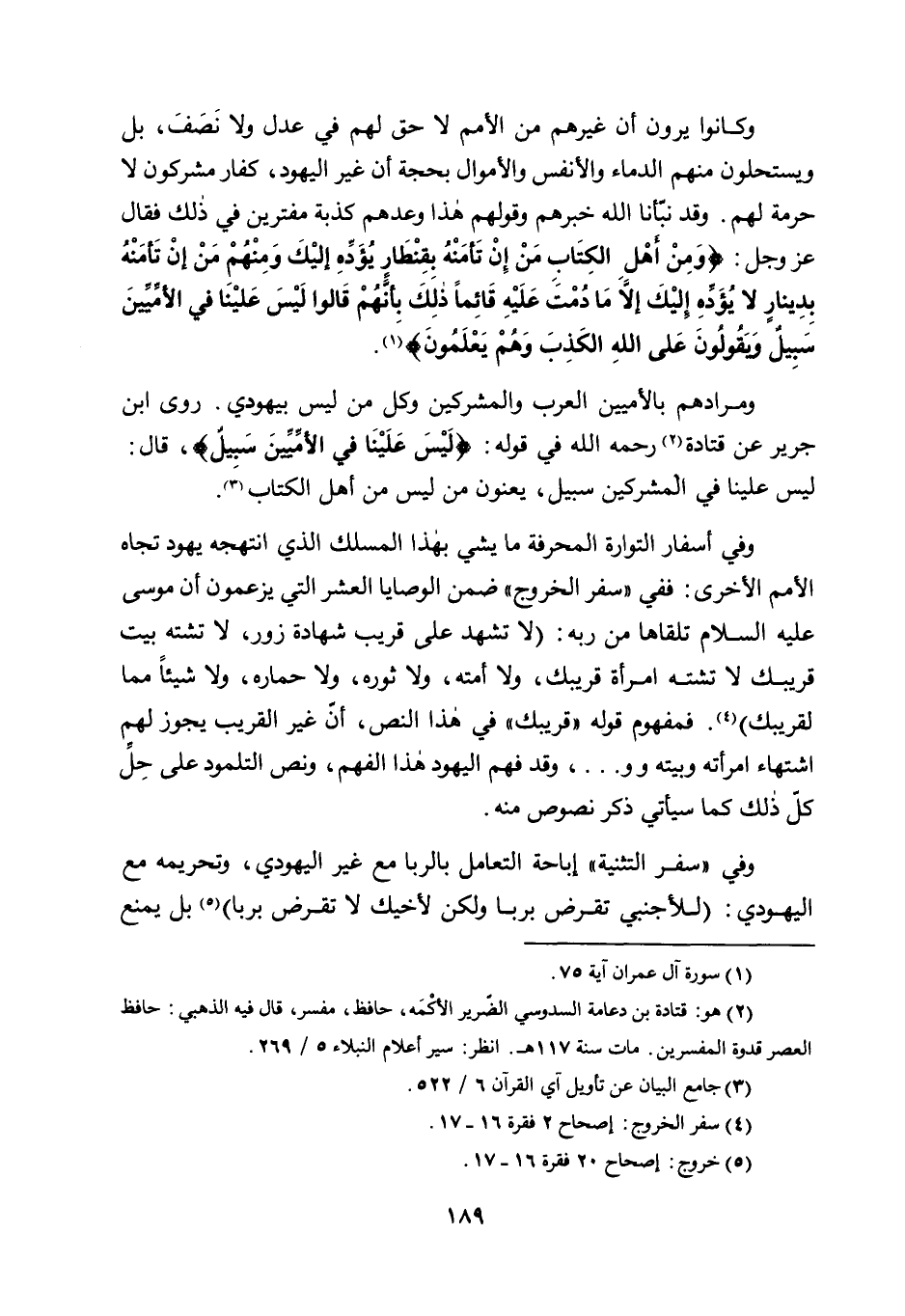 وفي "سفر التثنية" إباحة التعامل بالربا مع غير اليهودي، وتحريمه مع اليهودي: "للأجنبي تقرض بربا، ولكن لأخيك لا تقرض بربا"5؛ بل يمنع