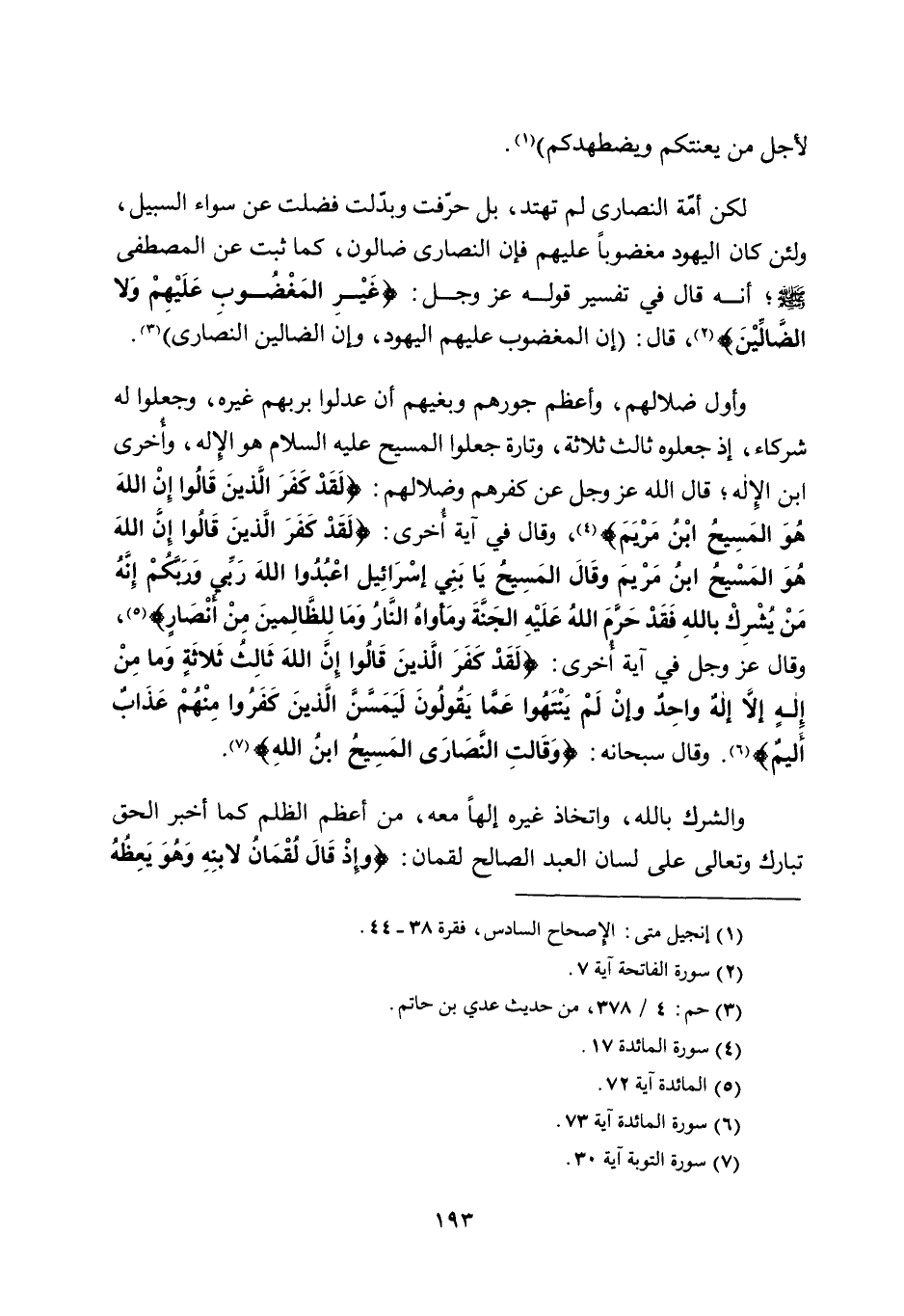 لكن أمة النصارى لم تهتد؛ بل حرفت وبدلت فصلت عن سواء السبيل، ولئن كان اليهود مغضوبًا عليهم فإن النصارى ضالون، كما ثبت عن المصطفى صلى الله عليه وسلم؛ أنه قال في تفسير قوله عز وجل: {غَيْرِ الْمَغْضُوبِ عَلَيْهِمْ وَلا الضَّالِّينَ} 2، قال: "إن المغضوب عليهم اليهود، وإن الضالين النصارى" 3.