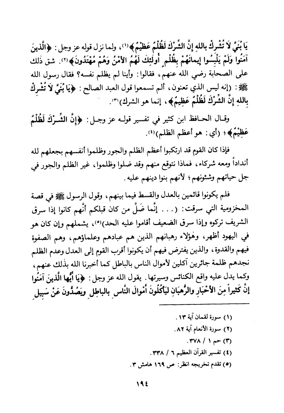 يَا بُنَيَّ لا تُشْرِكْ بِاللَّهِ إِنَّ الشِّرْكَ لَظُلْمٌ عَظِيمٌ} 1، ولما نزل قوله عز وجل: {الَّذِينَ آمَنُوا وَلَمْ يَلْبِسُوا إِيمَانَهُمْ بِظُلْمٍ أُولَئِكَ لَهُمُ الْأَمْنُ وَهُمْ مُهْتَدُونَ} 2. شق ذلك على الصحابة رضي الله عنهم؛ فقالوا: وأينا لم يظلم نفسه؟ فقال رسول الله صلى الله عليه وسلم: "إنه ليس الذي تعنون، ألم تسمعوا قول العبد الصالح: {يَا بُنَيَّ لا تُشْرِكْ بِاللَّهِ إِنَّ الشِّرْكَ لَظُلْمٌ عَظِيم} ؛ إنما هو الشرك" 3.