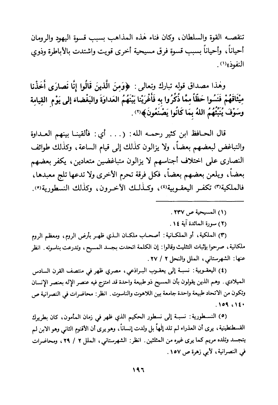 قال الحافظ ابن كثير رحمه الله: "أي: فألقينا بينهم العداوة والتباغض لبعضهم بعضًا، ولا يزالون كذلك إلى قيام الساعة، وكذلك طوائف النصارى على اختلاف أجناسهم لا يزالون متباغضين متعادين، يكفر بعضهم بعضًا، ويلعن بعضهم بعضًا؛ فكل فرقة تحرم الأخرى ولا تدعها تلج معبدها، فالملكية3 تكفر اليعقوبية4، وكذلك الآخرون، وكذلك النسطورية5.