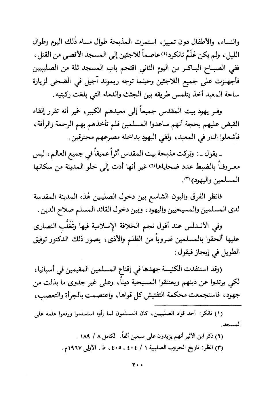 والنساء، والأطفال دون تمييز، استمرت المذبحة طوال مساء ذلك اليوم وطوال الليل، ولم يكن علم تانكرد1 عاصمًا للاجئين إلى المسجد الأقصى من القتل؛ ففي الصباح الباكر من اليوم الثاني اقتحم باب المسجد ثلثة من الصليبيين فأجهزت على جميع اللاجئين وحينما توجه ريموند آجيل في الضحى لزيارة ساحة المعبد أخذ يتلمس طريقه بين الجثث والدماء التي بغلت ركبتيه.