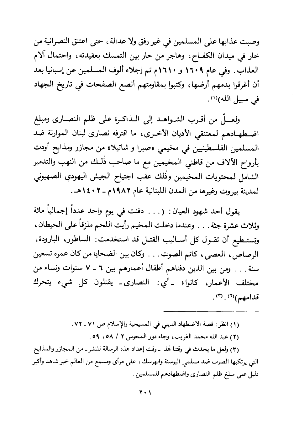3 ولعل ما يحدث في وقتنا هذا -وقت إعداد هذه الرسالة للنشر- من المجازر والمذابح التي يرتكبها الصرب ضد مسلمي البوسنة والهرسك، على مرأى ومسمع من العالم خير شاهد وأكبر دليل على مبلغ ظلم النصارى واضطهادهم للمسلمين.