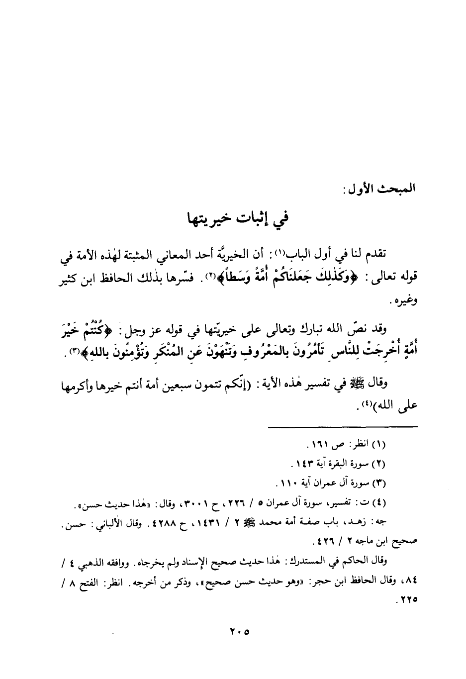 تقدم لنا في أول الباب1: أن الخيرية أحد المعاني المثبتة لهذه الأمة في قوله تعالى: {وَكَذَلِكَ جَعَلْنَاكُمْ أُمَّةً وَسَطًا} 2؛ فسرها بذلك الحافظ ابن كثير وغيره.