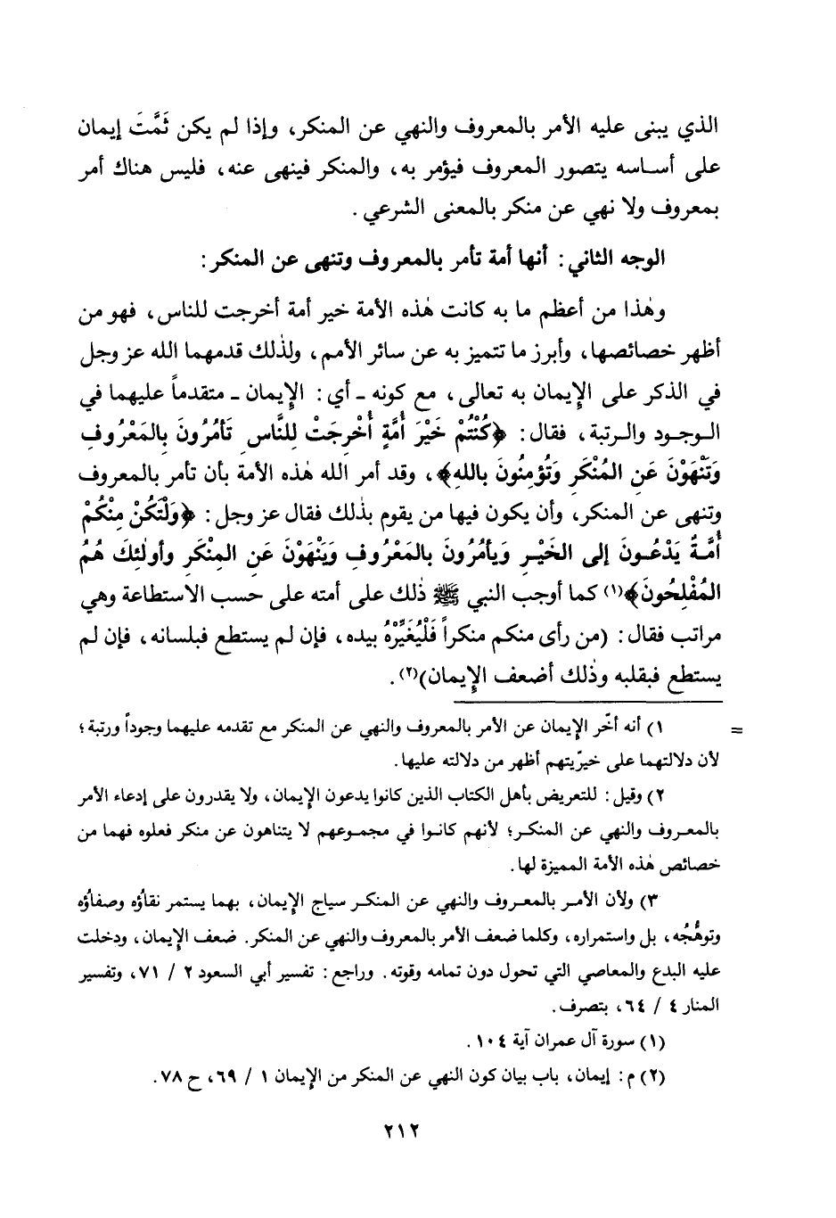 وهذا من أعظم ما به كانت هذه الأمة خير أمة أخرجت للناس؛ فهو من أظهر خصائصها، وأبرز ما تتيمز به عن سائر الأمم، ولذلك قدمهما الله عز وجل في الذكر على الإيمان به تعالى، مع كونه -أي: الإيمان- متقدمًا عليهما في الوجود والرتبة؛ فقال: {كُنْتُمْ خَيْرَ أُمَّةٍ أُخْرِجَتْ لِلنَّاسِ تَأْمُرُونَ بِالْمَعْرُوفِ وَتَنْهَوْنَ عَنِ الْمُنْكَرِ وَتُؤْمِنُونَ بِاللَّهِ} ، وقد أمر الله هذه الأمة بأن تأمر بالمعروف وتنهى عن المنكر، وأن يكون فيها من يقوم بذلك فقال عز وجل: {وَلْتَكُنْ مِنْكُمْ أُمَّةٌ يَدْعُونَ إِلَى الْخَيْرِ وَيَأْمُرُونَ بِالْمَعْرُوفِ وَيَنْهَوْنَ عَنِ الْمُنْكَرِ وَأُولَئِكَ هُمُ الْمُفْلِحُونَ} 1، كما أوجب النبي صلى الله عليه وسلم ذلك على أمته على حسب الاستطاعة وهي مراتب فقال: "من رأى منكم منكرًا فليغيره بيده، فإن لم يستطع فبلسانه، فإن لم يستطع فبقلبه وذلك أضعف الإيمان" 2.