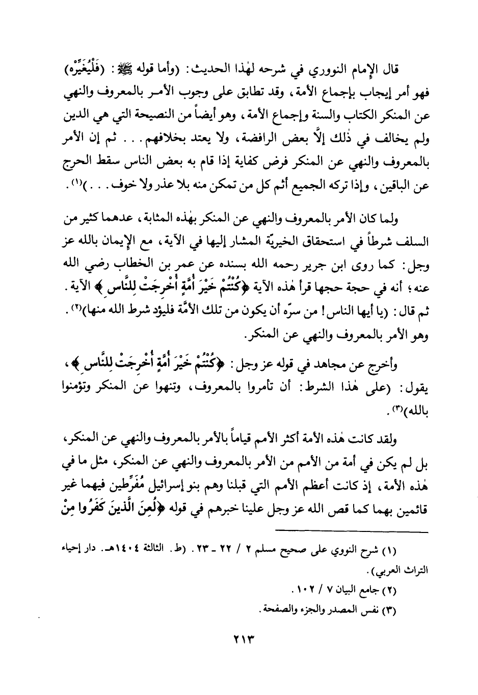 ولما كان الأمر بالمعروف والنهي عن المنكر بهذه المثابة، عدهما كثير من السلف شرطًا في استحقاق الخيرية المشار إليها في الآية، مع إيمان بالله عز وجل: كما روى ابن جرير رحمه الله بسنده عن عمر بن الخطاب رضي الله عنه؛ أنه في حجة حجها قرأ هذه الآية: {كُنْتُمْ خَيْرَ أُمَّةٍ أُخْرِجَتْ لِلنَّاسِ} الآية، ثم قال: "يا أيها الناس! من سره أن يكون من تلك الأمة فليؤد شرط الله منها"2.
