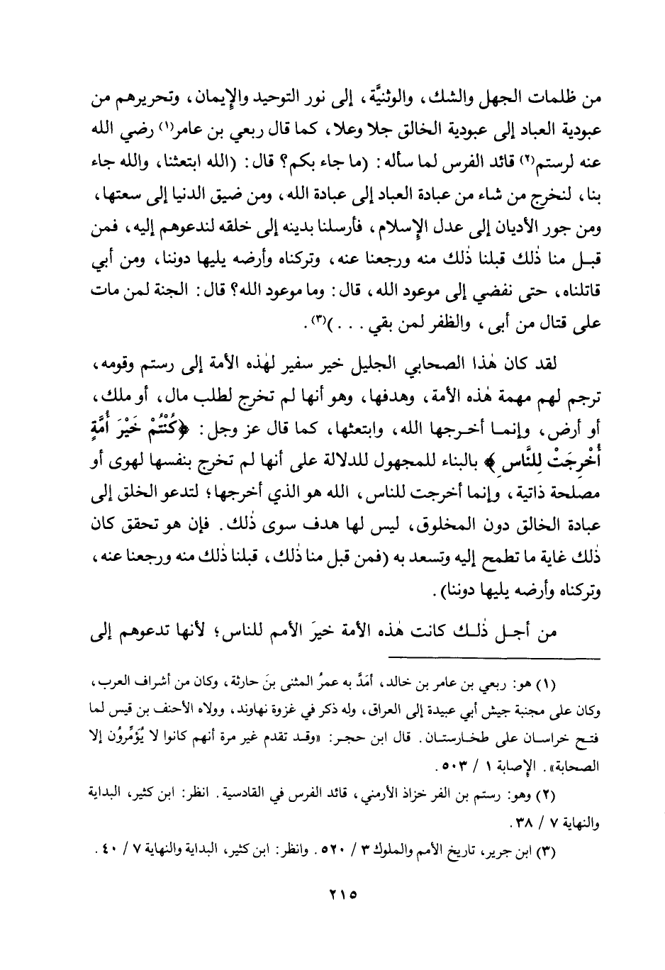 من ظلمات الجهل والشك، والوثنية، إلى نور التوحيد والإيمان، وتحريرهم من عبودية العباد إلى عبودية الخالق جلا وعلا، كما قال ربعي بن عامر1 رضي الله عنه لرستم2 قائد الفرس لما سأله: ما جاء بكم؟ قال: "الله ابتعثنا، والله جاء بنا، لنخرج من شاء من عبادة العباد إلى عبادة الله ومن ضيق الدنيا إلى سعتها، ومن جور الأديان إلى عدل الإسلام؛ فأرسلنا بدينه إلى خلقه لندعوهم إليه؛ فمن قبل منا ذلك قبلنا ذلك منه ورجعنا عنه، وتركناه وأرضه يليها دوننا، ومن أبى قاتلناه، حتى نقضي إلى موعود الله. قال: وما موعود الله؟ قال: الجنة لمن مات على قتال من أبى، والظفر لمن بقي"3.