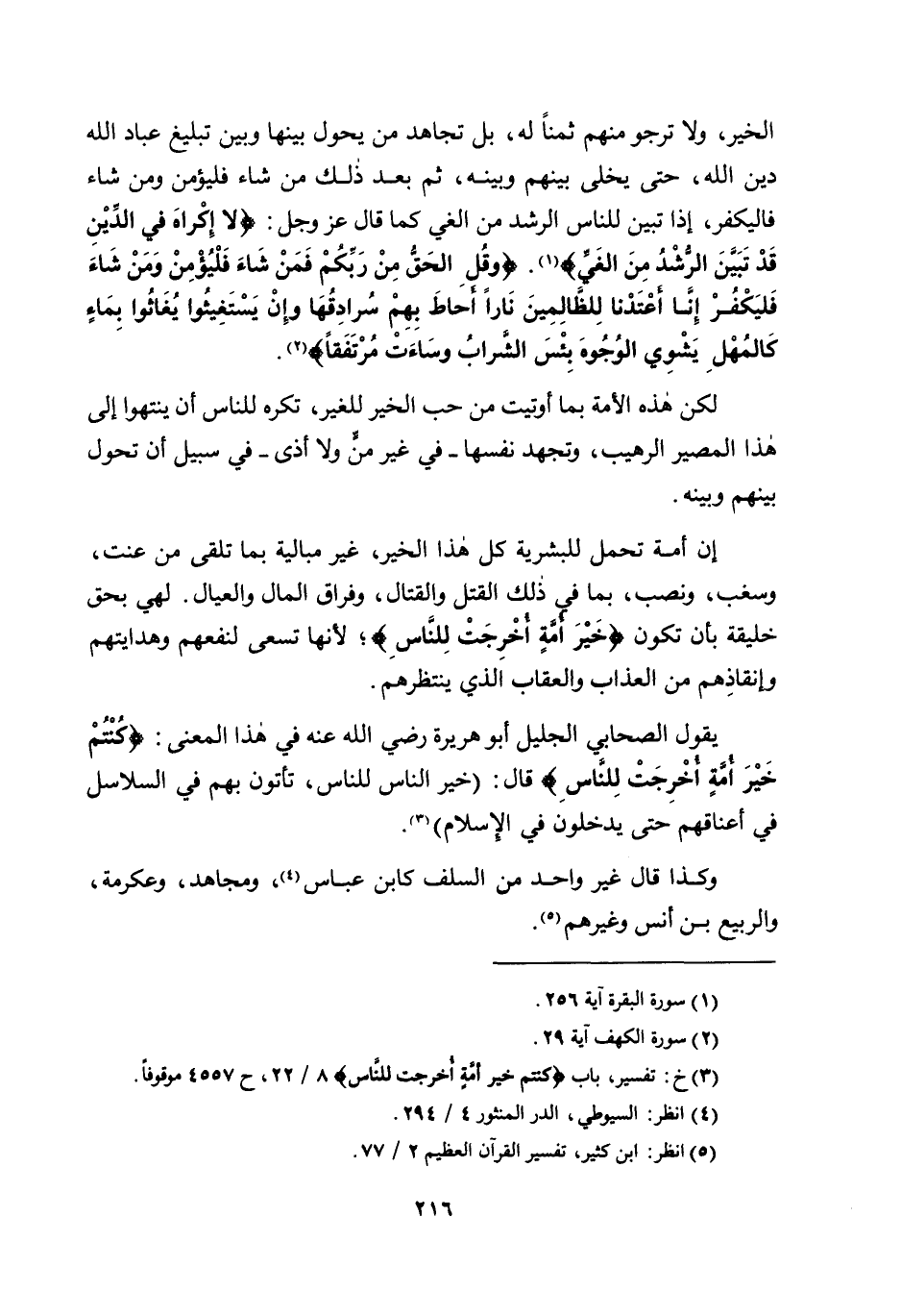 إن أمة تحمل للبشرية كل هذا الخير، غير مبالية بما تلقى من عنت، وسغب، ونصب، بما في ذلك القتل والقتال، وفراق المال والعيال. لهي بحق خليفة بأن تكون {خَيْرَ أُمَّةٍ أُخْرِجَتْ لِلنَّاسِ} ؛ لأنها تسعى لنفعهم وهدايتهم وإنقاذهم من العذاب والعقاب الذي ينتظرهم.