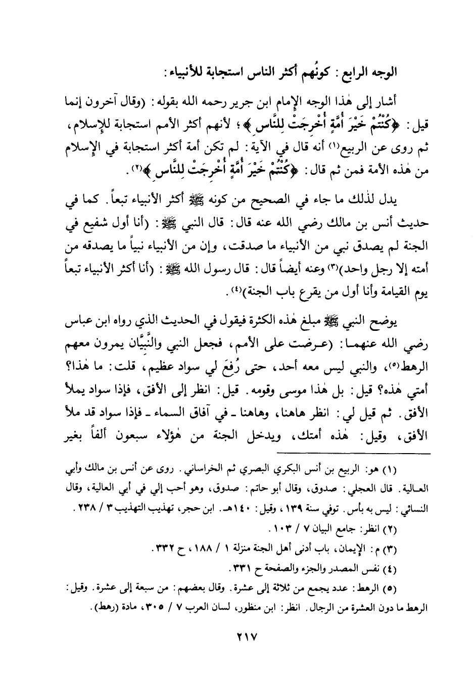 أشار إلى هذا الوجه الإمام ابن جرير رحمه الله بقوله: "وقال آخرون إنما قيل: {كُنْتُمْ خَيْرَ أُمَّةٍ أُخْرِجَتْ لِلنَّاسِ} ؛ لأنهم أكثر الأمم استجابة للإسلام، ثم روى عن الربيع1 أنه قال في الآية: لم تكن أمة أكثر استجابة في الإسلام من هذه الأمة؛ فمن ثم قال: {كُنْتُمْ خَيْرَ أُمَّةٍ أُخْرِجَتْ لِلنَّاسِ} 2.