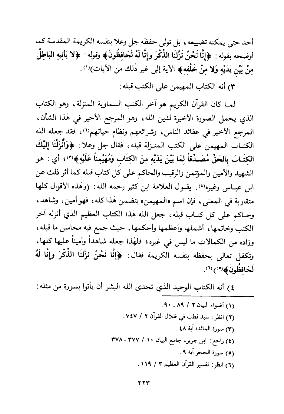 لما كان القرآن الكريم هو آخر الكتب السماوية المنزلة، وهو الكتاب الذي يحمل الصورة الأخيرة لدين الله، وهو المرجع الأخير في هذا الشأن المرجع الأخير في عقائد الناس، وشرائعهم ونظام حياتهم2؛ فقد جعله الله الكتاب المهيمن على الكتب المنزلة قبله، فقال جل وعلا: {وَأَنْزَلْنَا إِلَيْكَ الْكِتَابَ بِالْحَقِّ مُصَدِّقًا لِمَا بَيْنَ يَدَيْهِ مِنَ الْكِتَابِ وَمُهَيْمِنًا عَلَيْهِ} 3؛ أي: هو الشهيد والأمين والمؤتمن والرقيب والحاكم على كل كتاب قبله كما أثر ذلك عن ابن عباس وغيره4. يقول العلامة ابن كثير رحمه الله: "وهذه الأقوال كلها متقاربة في المعنى؛ فإن اسم "المهيمن" يتضمن هذا كله، فهو أمين، وشاهد، وحاكم على كل كتاب قبله، وجعل الله هذا الكتاب العظيم الذي أنزله آخر الكتب وخاتمها، أشملها وأعظمها وأحكمها؛ حيث جمع فيه محاسن ما قبله، وزاده من الكمالات ما ليس في غيره؛ فلهذا جعله شاهدًا وأمينًا عليها كلها، وتكفل تعالى بحفظه بنفسه الكريمة فقال: {إِنَّا نَحْنُ نَزَّلْنَا الذِّكْرَ وَإِنَّا لَهُ لَحَافِظُونَ} 5، 6.