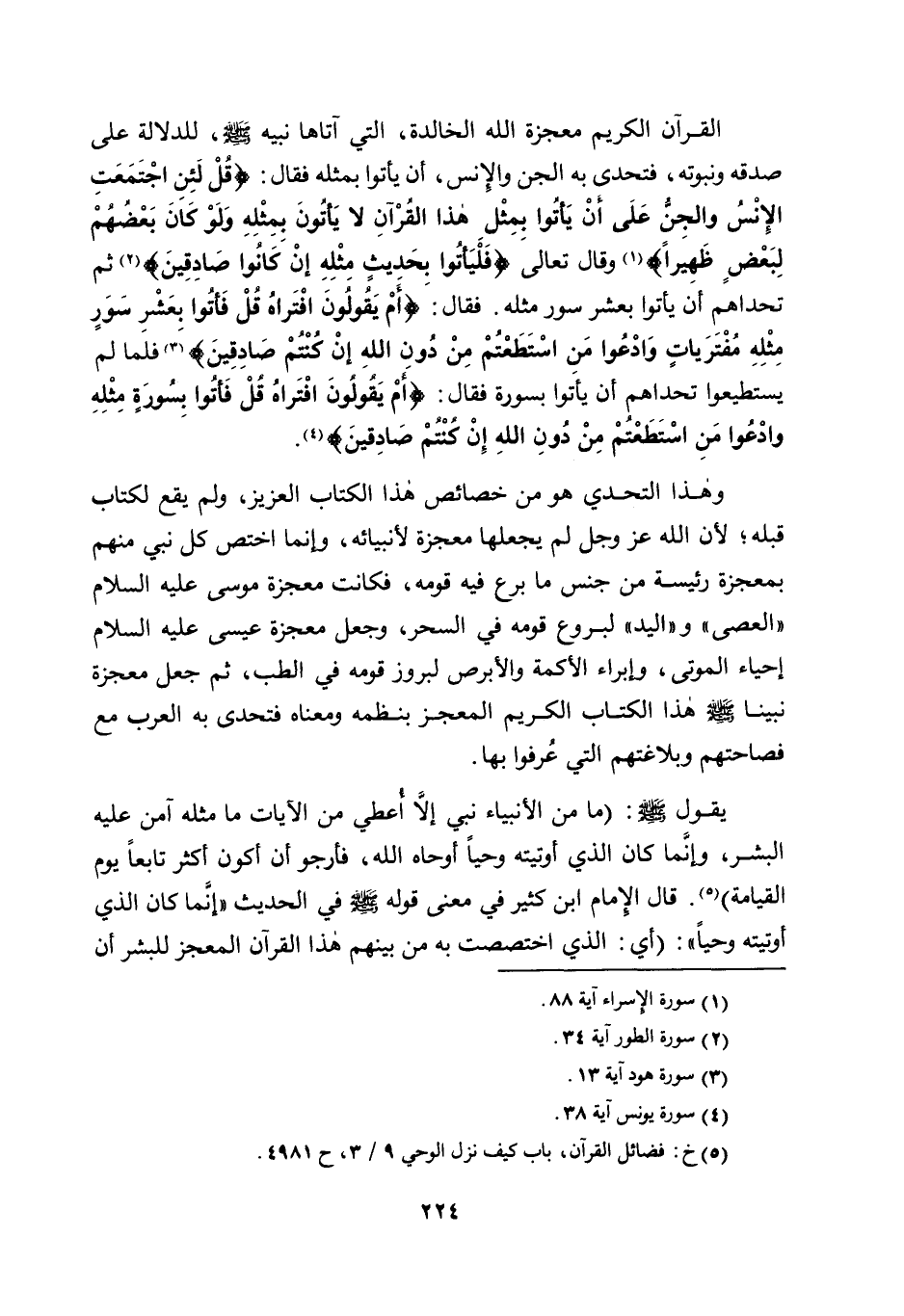 يقول صلى الله عليه وسلم: "ما من الأنبياء نبي إلا أعطي من الآيات ما مثله آمن عليه البشر؛ وإنما كان الذي أوتيته وحيًا أوحاه الله، فأرجو أن أكون أكثر تابعًا يوم القيامة" 5، قال الإمام ابن كثير في معنى قوله صلى الله عليه وسلم في الحديث: "إنما كان الذي أوتيته وحيًا" أوحاه الله؛ فأرجو أن أكون أكثر تابعًا يوم القايمة" 5. قال الإمام ابن كثير في معنى قوله صلى الله عليه وسلم في الحديث: "إنما كان الذي أوتيته وحيًا": "أي: الذي اختصصت به من بينهم هذا القرآن المعجز للبشر أن