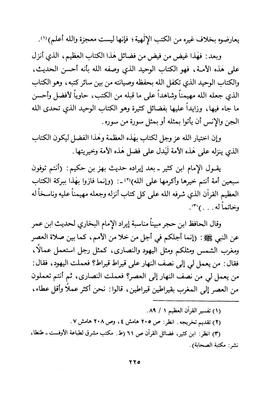 يقول الإمام ابن كثير -يعد إيراده حديث بهز بن حكيم: "أنتم توفون سبعين أمة أنتم خيرها وأكرمها على الله"2-: "وإنما فازوا بهذه ببركة الكتاب العظيم القرآن الذي شرفه الله على كل كتاب أنزله وجعله مهيمنًا عليه وناسخًا له وخاتمًا له"3.