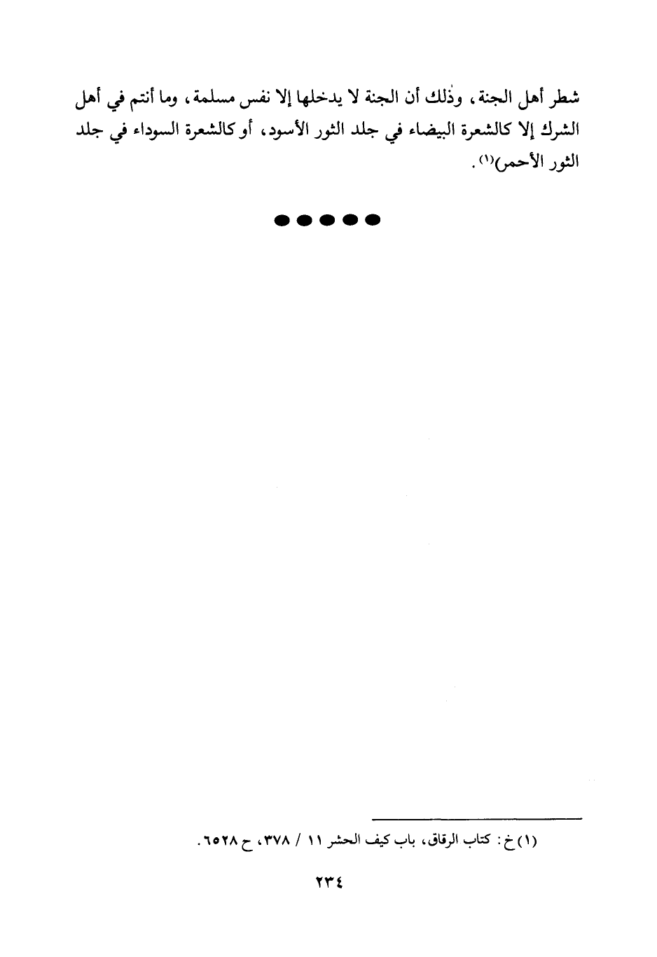 شطر أهل الجنة الجنة، وذلك أن الجنة لا يدخلها إلا نفس مسلمة، وما أنتم في أهل الشرك إلا الشرك إلا كالشعرة البيضاء في جلد الثور الأسود، أو كالشعرة السوداء في جلد الثور الأحمر" 1.