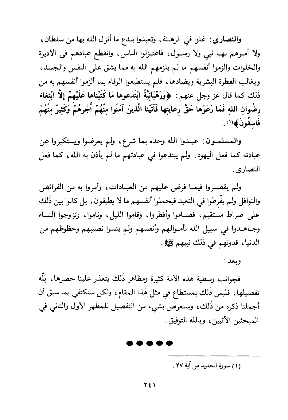 والنصارىِ: غلوا في الرهبنة، وتعبدوا ببدع ما أنزل الله بها من سلطان، ولا أمرهم بها نبي ولا رسول، فاعتزلوا الناس، وانقطع عبادهم في الأديرة والخلوات وألزموا أنفسهم ما لم يلزمهم الله به مما يشق على النفس والجسد، ويغالب الفطرة البشرية ويضادها؛ فلم يستطيعوا الوفاء ألزموا أنفسهم به من ذلك كما قال عز وجل عنهم: {وَرَهْبَانِيَّةً ابْتَدَعُوهَا مَا كَتَبْنَاهَا عَلَيْهِمْ إِلَّا ابْتِغَاءَ رِضْوَانِ اللَّهِ فَمَا رَعَوْهَا حَقَّ رِعَايَتِهَا فَآتَيْنَا الَّذِينَ آمَنُوا مِنْهُمْ أَجْرَهُمْ وَكَثِيرٌ مِنْهُمْ فَاسِقُونَ} 1.
