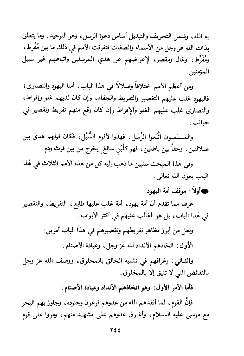 ومن أعظم الأمم اختلافًا وضلالًا في هذا الباب، أمة اليهود والنصارى؛ فاليهود غلب عليهم التقصير والتفريط والجفاء، وإن كان لديهم غلو وإفراط، والنصارى غلب عليهم الغلو والإفراط وإن كان وقع منهم تفريط وتقصير في جوانب.
