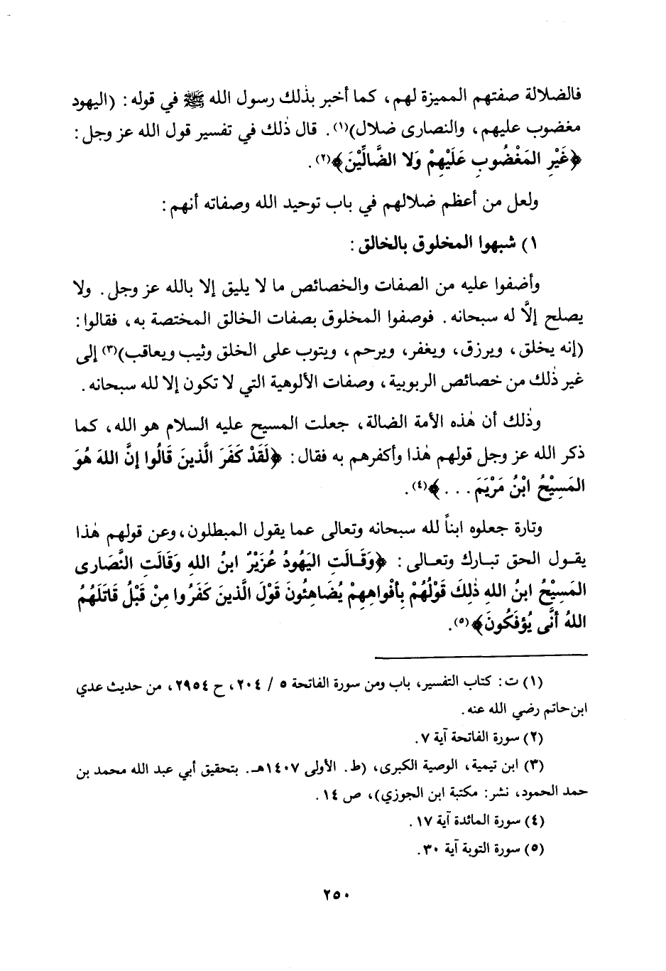 لقد ضلت أمة النصارى في هذا الباب ضلالًا بعيدًا، ولعل أمة من الأمم لم تضل في دينها وربها وإلهها كما ضل الذين قالوا إنا نصارى. ولا عجب فالضلالة صفتهم المميزة لهم، كما أخبر بذلك رسول الله صلى الله عليه وسلم في قوله: "اليهود مغضوب عليهم، والنصارى ضلال" 1. قال ذلك في تفسير قول الله عز وجل: {غَيْرِ الْمَغْضُوبِ عَلَيْهِمْ وَلا الضَّالِّينَ} 2.