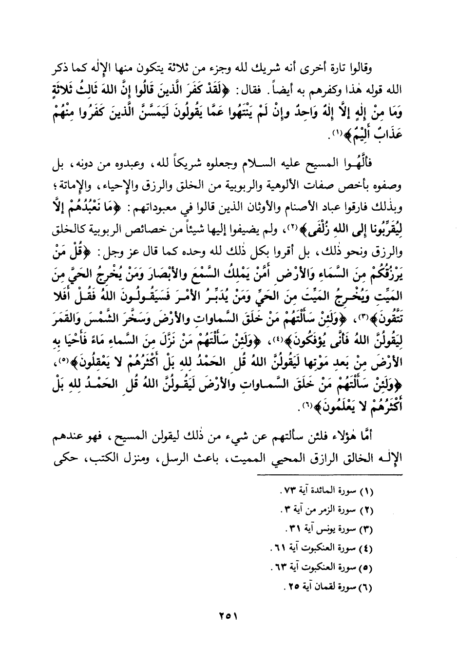 أما هؤلاء فلئن سألتهم عن شيء من ذلك ليقولن المسيحِ؛ فهو عندهم الإله الخالق الرازق المحيي المميت، باعث الرسل، ومنزل الكتب، حكى