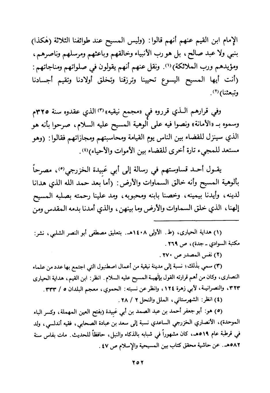 3 سمي بذلك؛ نسبة إلى مدينة نيقية من أعمال إسطنبول التي اجتمع بها عدد من علماء النصارى، وكان من أهم قراراته القول بإلهية المسيح عليه السلام. انظر: ابن القيم، هداية الحيارى 323، والنصرانية، لأبي زهرة 124، وانظر عن نسبته: الحموي، معجم البلدان 5/ 333.