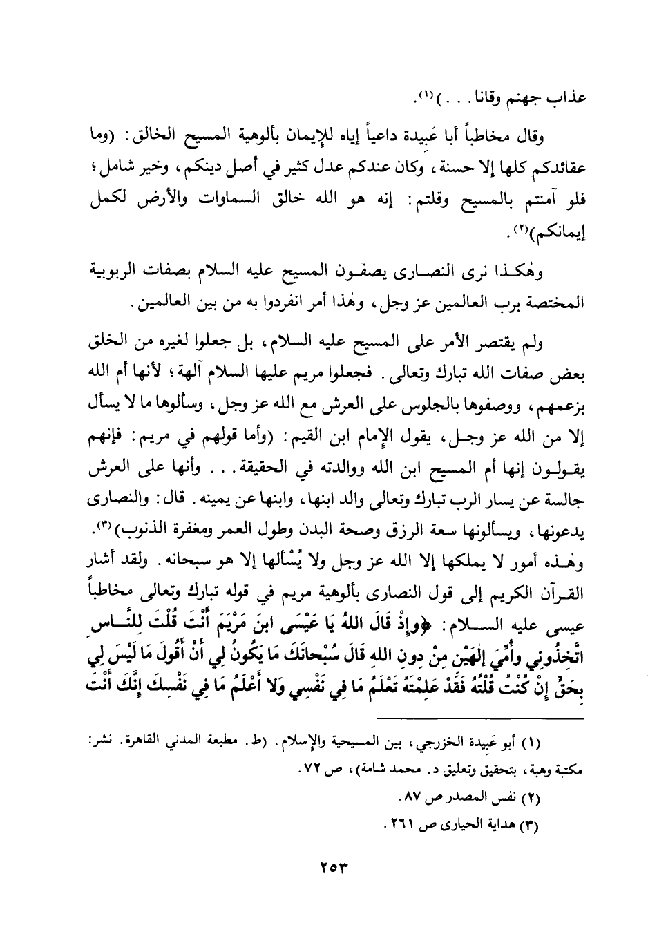 1 أبو عبيدة الخزرجي، بين المسيحيية والإسلام. "ط. مطبعة المدني القاهرة. نشر: مكتبة وهبة، بتحقيق وتعليق د. محمد شامة"، ص72.