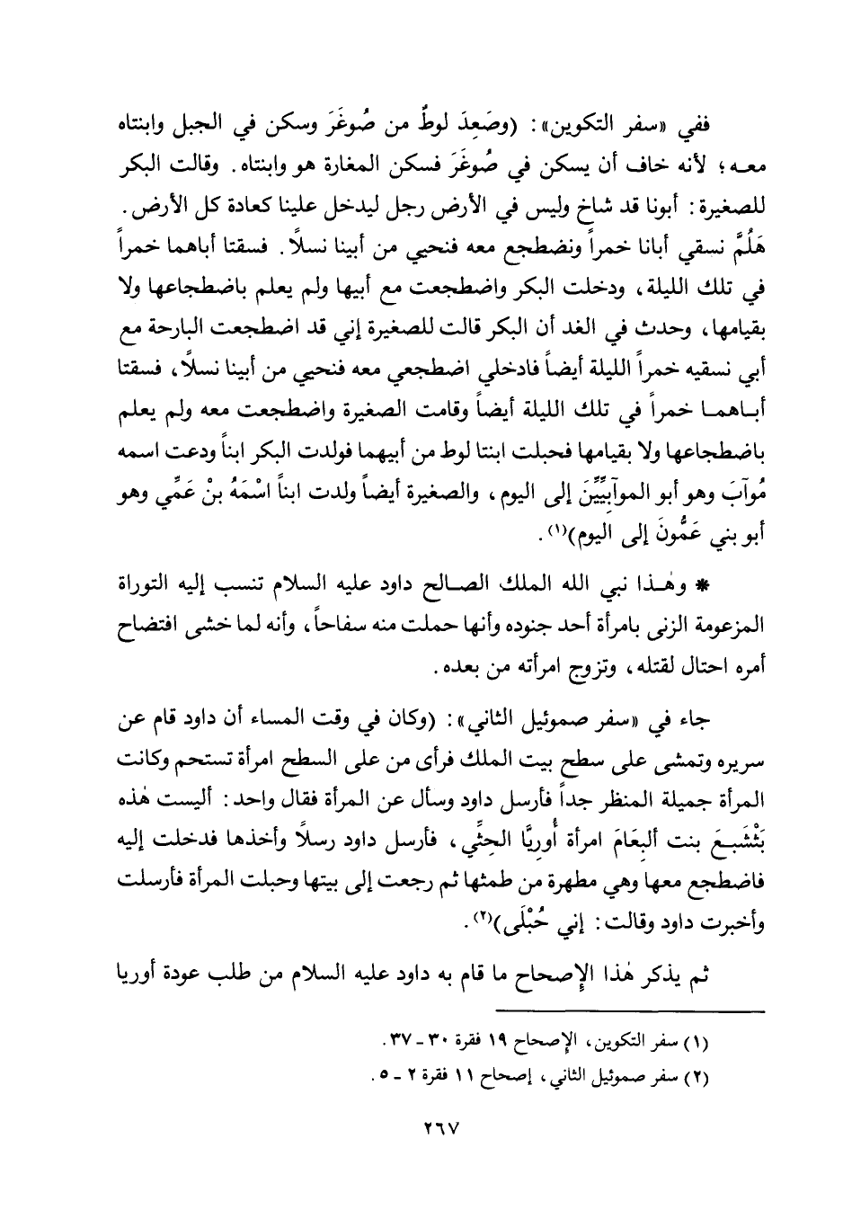 وهذا نبي الله الملك الصالح داود عليه السلام تنسب إليه التوراة المزعومة الزنى بامرأة أحد جنوده، وأنها حملت منه سفاحًا، وإنه لما خشي افتضاح أمره احتال لقتله، وتزوج امرأته من بعده.
