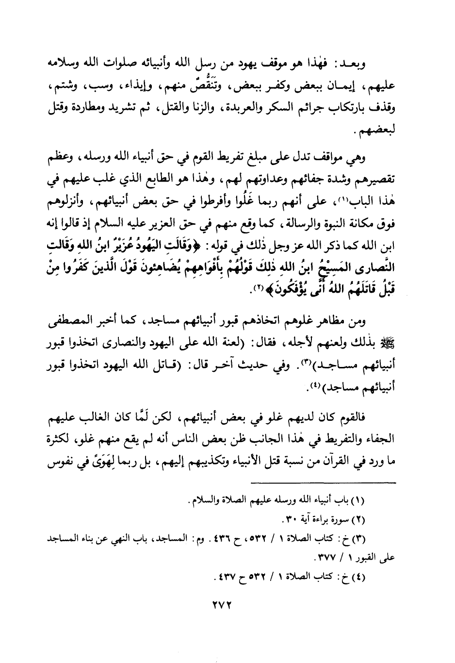 ومن مظاهر غلوهم اتخاذهم قبور أنبيائهم مساجد، كما أخبر المصطفى صلى الله عليه وسلم بذلك ولعنهم لأجله؛ فقال: "لعنة الله على اليهود والنصارى اتخذوا قبور أنبيائهم مساجد" 3. وفي حديث آخر قال: "قاتل الله اليهود اتخذوا قبور أنبيائهم مساجد" 4.