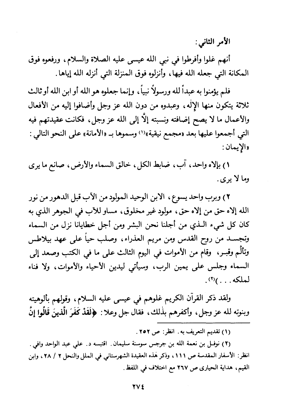 فلم يؤمنوا به عبدًا لله ورسولًا نبيًا؛ وإنما جعلوه هو الله أو ابن الله أو ثالث ثلاثة يتكون منها الإله، وعبدوه من دون الله عز وجل وأضافوا إليه من الأفعال والأعمال ما لا يصح إضافته ونسبته إلا إلى الله عز وجل؛ فكانت عقيدتهم فيه التي أجمعوا عليها بعد "مجمع نيقية"1 وسموها بـ "الأمانة" على النحو التالي: "الإيمان: