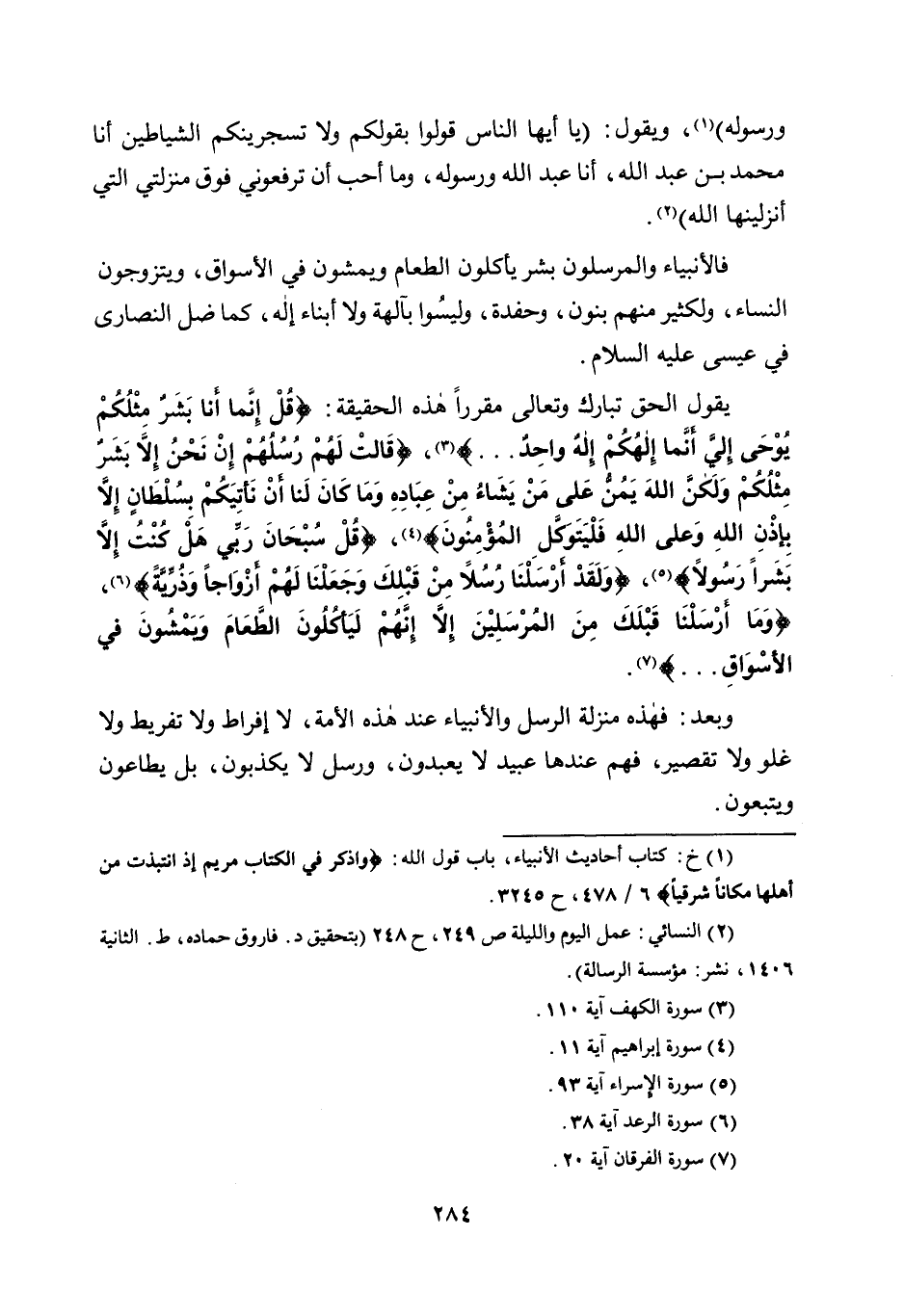 يقول الحق تبارك وتعالى مقررًا هذه الحقيقة: {قُلْ إِنَّمَا أَنَا بَشَرٌ مِثْلُكُمْ يُوحَى إِلَيَّ أَنَّمَا إِلَهُكُمْ إِلَهٌ وَاحِدٌ} 3، {قَالَتْ لَهُمْ رُسُلُهُمْ إِنْ نَحْنُ إِلَّا بَشَرٌ مِثْلُكُمْ وَلَكِنَّ اللَّهَ يَمُنُّ عَلَى مَنْ يَشَاءُ مِنْ عِبَادِهِ وَمَا كَانَ لَنَا أَنْ نَأْتِيَكُمْ بِسُلْطَانٍ إِلَّا بِإِذْنِ اللَّهِ وَعَلَى اللَّهِ فَلْيَتَوَكَّلِ الْمُؤْمِنُونَ} 4، {قُلْ سُبْحَانَ رَبِّي هَلْ كُنْتُ إِلَّا بَشَرًا رَسُولًا} 5، {وَلَقَدْ أَرْسَلْنَا رُسُلًا مِنْ قَبْلِكَ وَجَعَلْنَا لَهُمْ أَزْوَاجًا وَذُرِّيَّةً} 6، {وَمَا أَرْسَلْنَا قَبْلَكَ مِنَ الْمُرْسَلِينَ إِلَّا إِنَّهُمْ لَيَأْكُلُونَ الطَّعَامَ وَيَمْشُونَ فِي الْأَسْوَاقِ} 7.